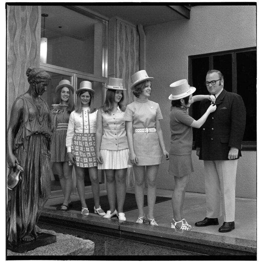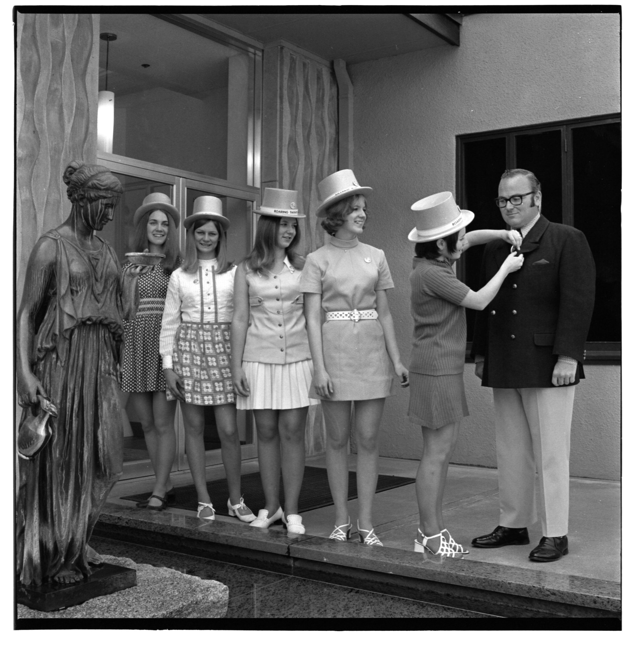 Negative, sheet film. 2 x 2 b&w. No. 1427. OB Corp TV. Port Townsend Princesses visit the Olympia brewery. No ID on man.