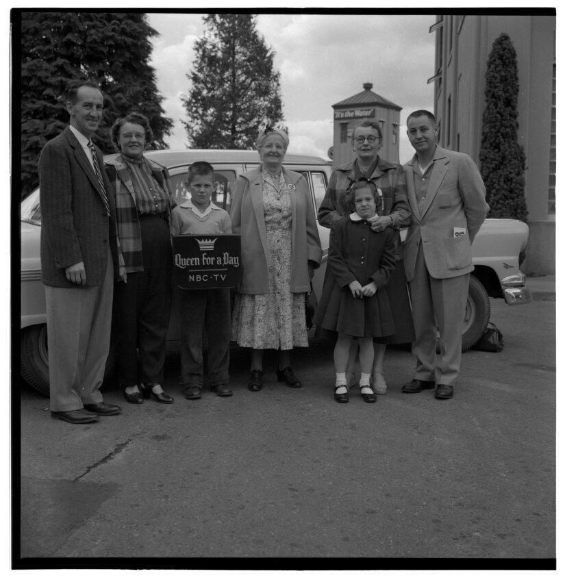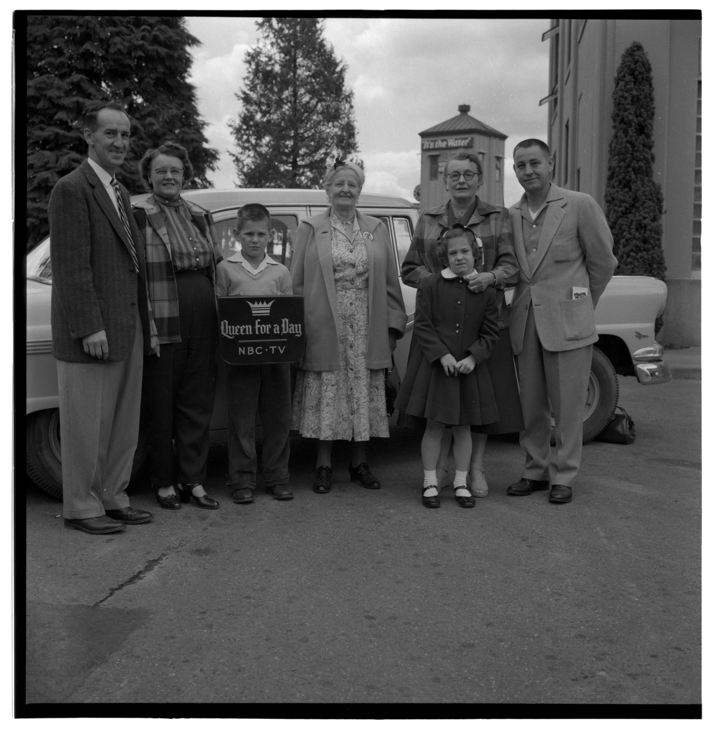 Negative, sheet film. 2 x 2 b&w. No. 289. OB Corp TV. NBC-TV's Queen for a Day visits the Olympia brewery. Article in "It's the Water News" Sept 1956 page 98. Bump Schmidt at left. No ID on others.Name/Title