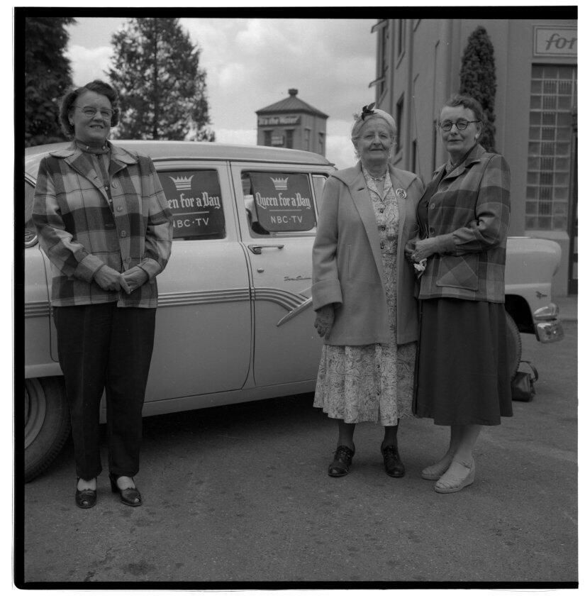 Negative, sheet film. 2 x 2 b&w. No. 289. OB Corp TV. NBC-TV's Queen for a Day visits the Olympia brewery. Article in "It's the Water News" Sept 1956 page 98. No ID on people.