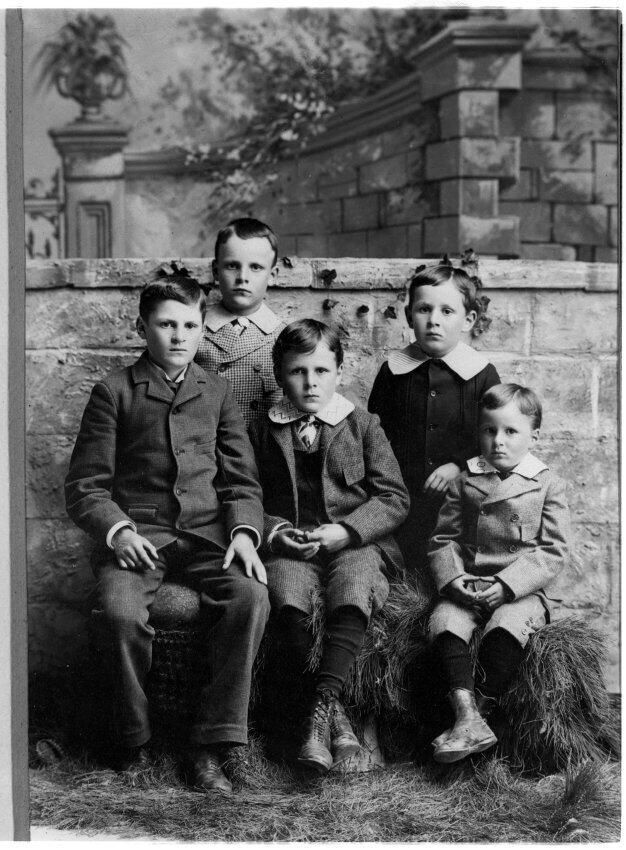 Negative, sheet film. 5 x 4 b&w. Five sons of Leopold and Johanna Schmidt. Left to right: Peter G., Leo Jr., Frank, Adolph, Frederick.