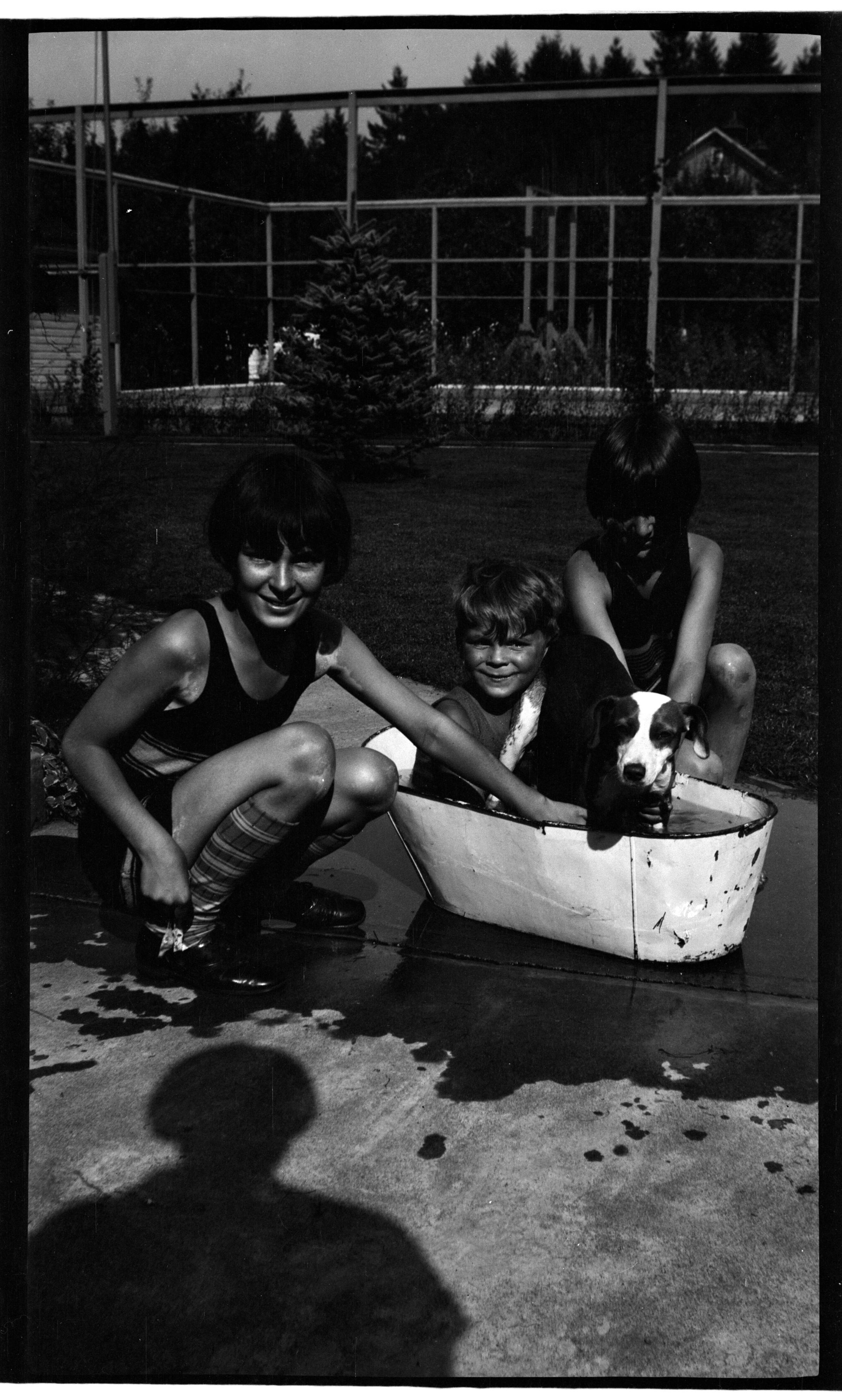 Negative, sheet film. 4 x 2.5 b&w. Schmidt family photos. Three children and dog at Schmidt house. No ID on children, but boy may be Peter G. Schmidt Jr.