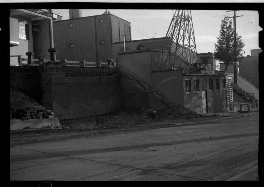 Negative, sheet film. 1 x 1.5 b&w. Early stage of construction on power plant building.