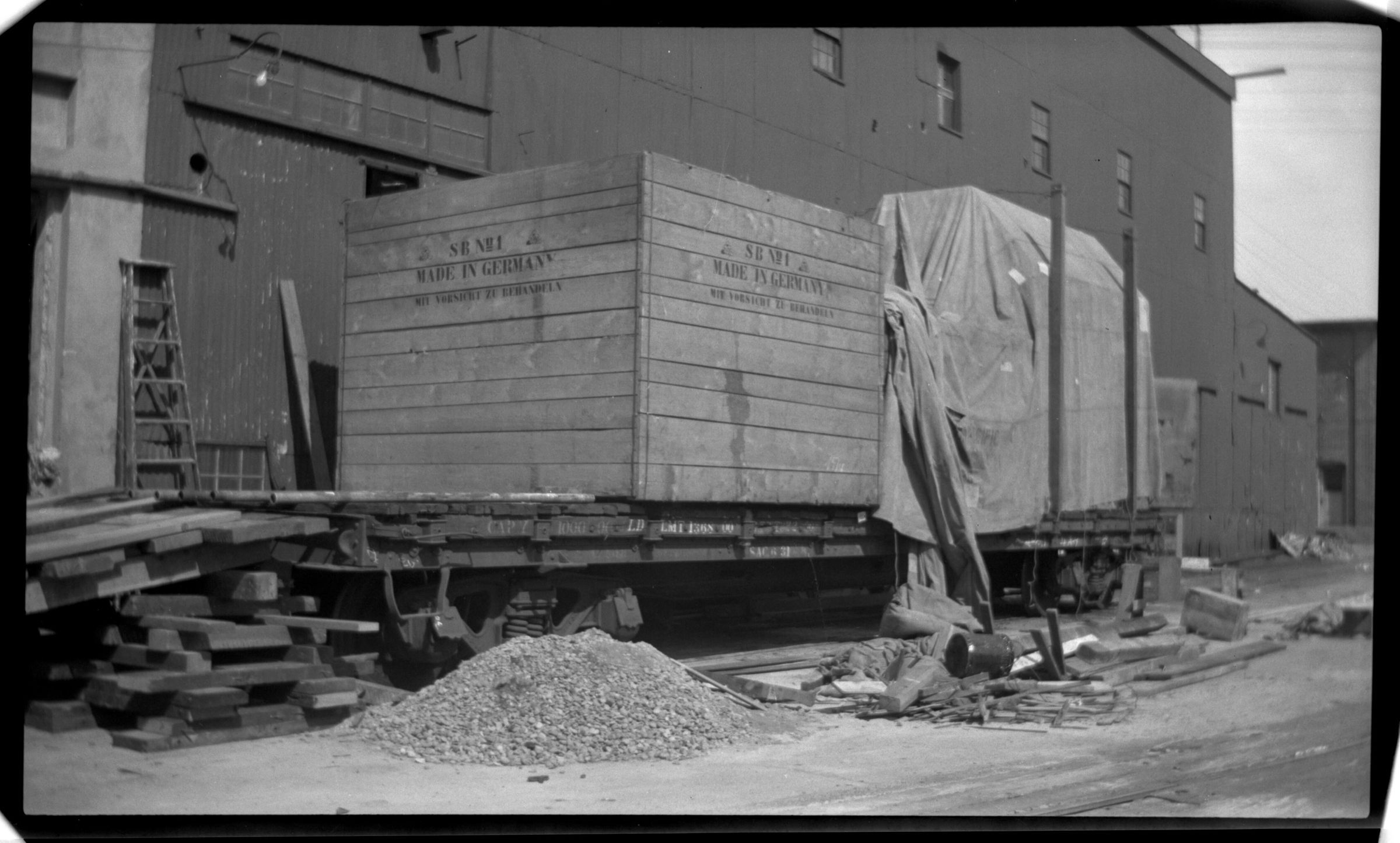 Negative, sheet film. 3 x 4 b&w. Equipment from Germany being moved into Salem brewery.