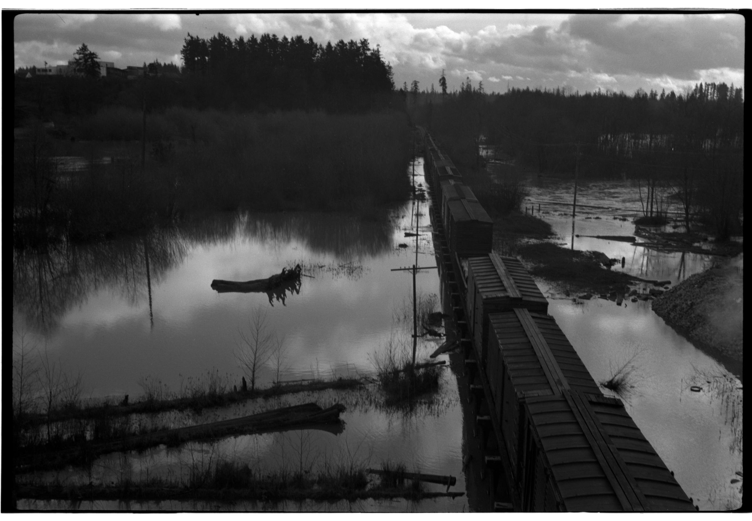 Negative, sheet film. 2 x 3 b&w. Swamp from highway bridge.