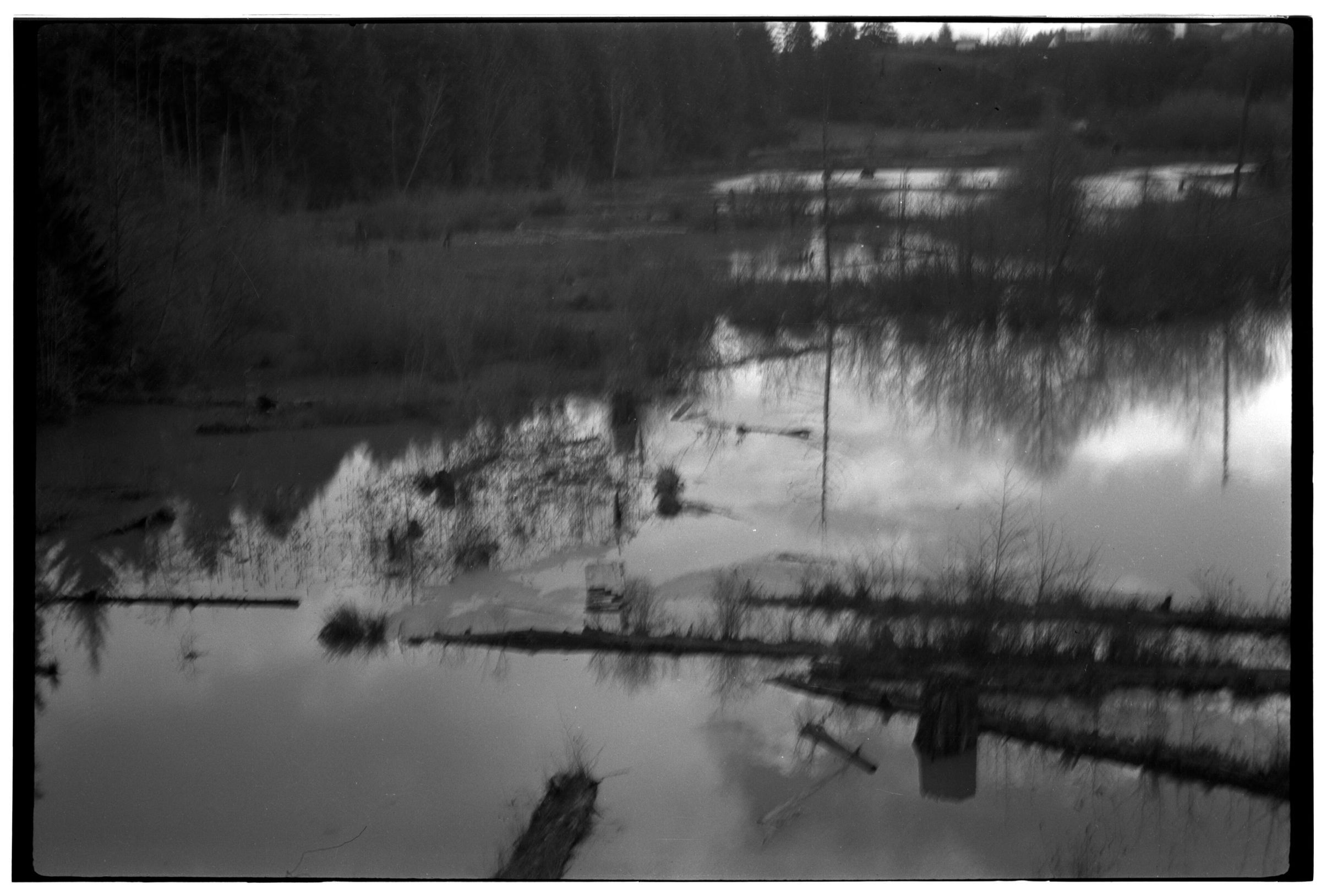 Negative, sheet film. 2 x 3 b&w. Swamp from highway bridge.