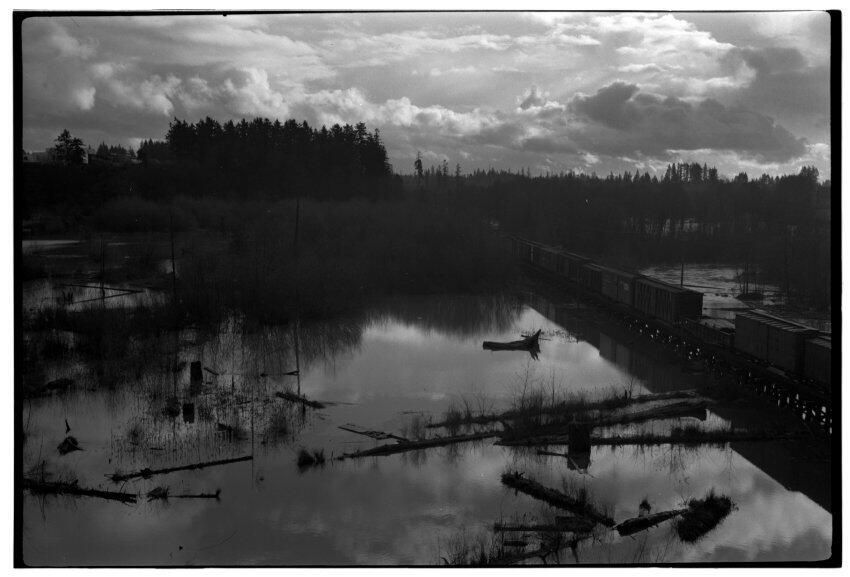 Negative, sheet film. 2 x 3 b&w. Swamp from highway bridge.