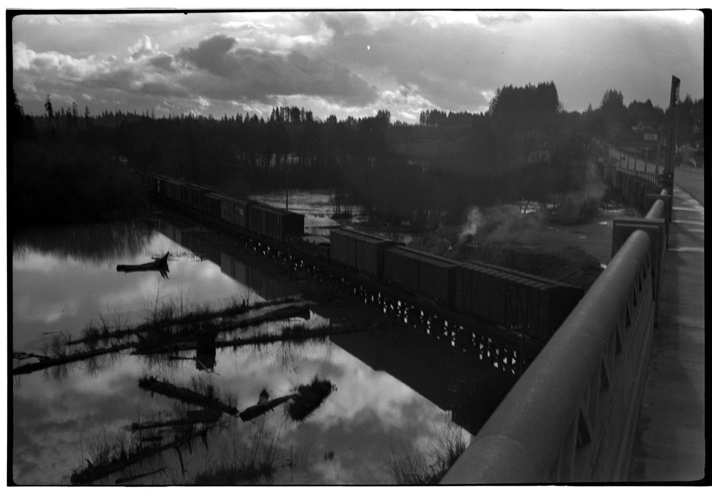 Negative, sheet film. 2 x 3 b&w. Swamp from highway bridge.