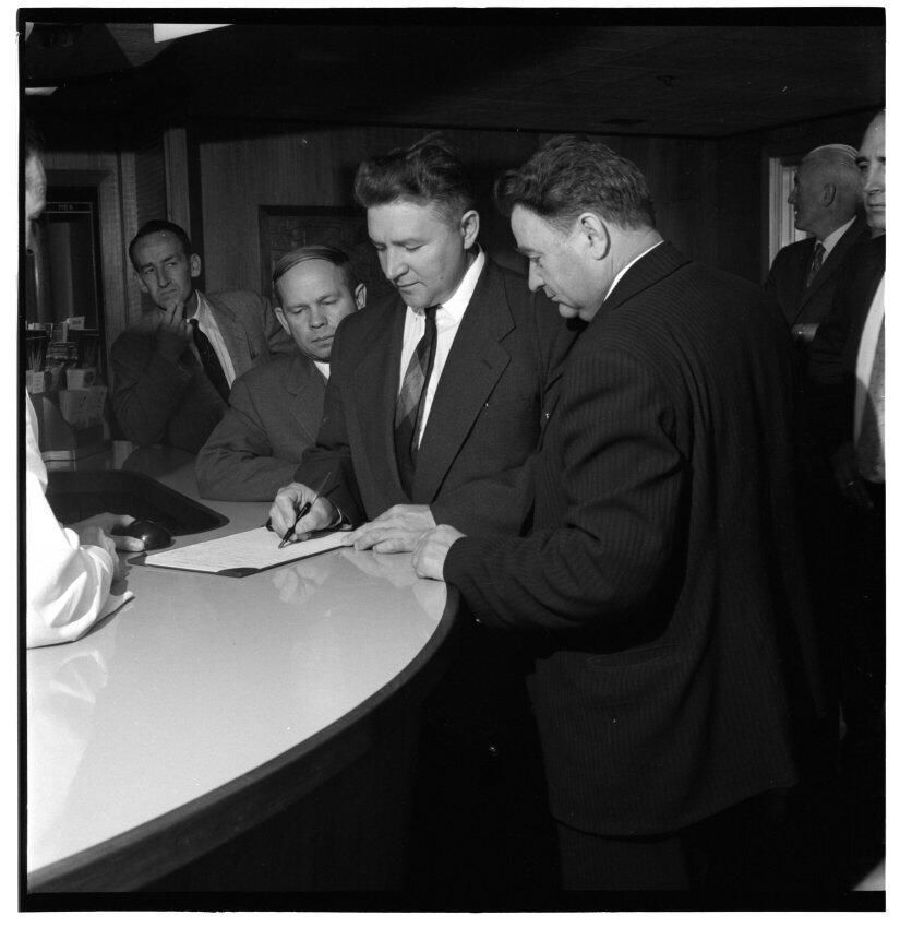 Negative, sheet film. 2 x 2 b&w. No. 690. OB Corp TV. Group of Russians visit Olympia brewery. Bump Schmidtd at left. No ID on others.