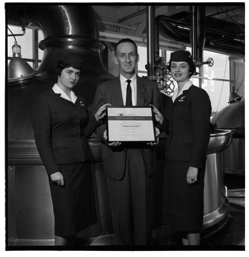 Negative, sheet film. 2 x 2 b&w. No. 690. OB Corp TV.Group of Russians visit Olympia brewery. Bump Schmidt in center. No ID on women.
