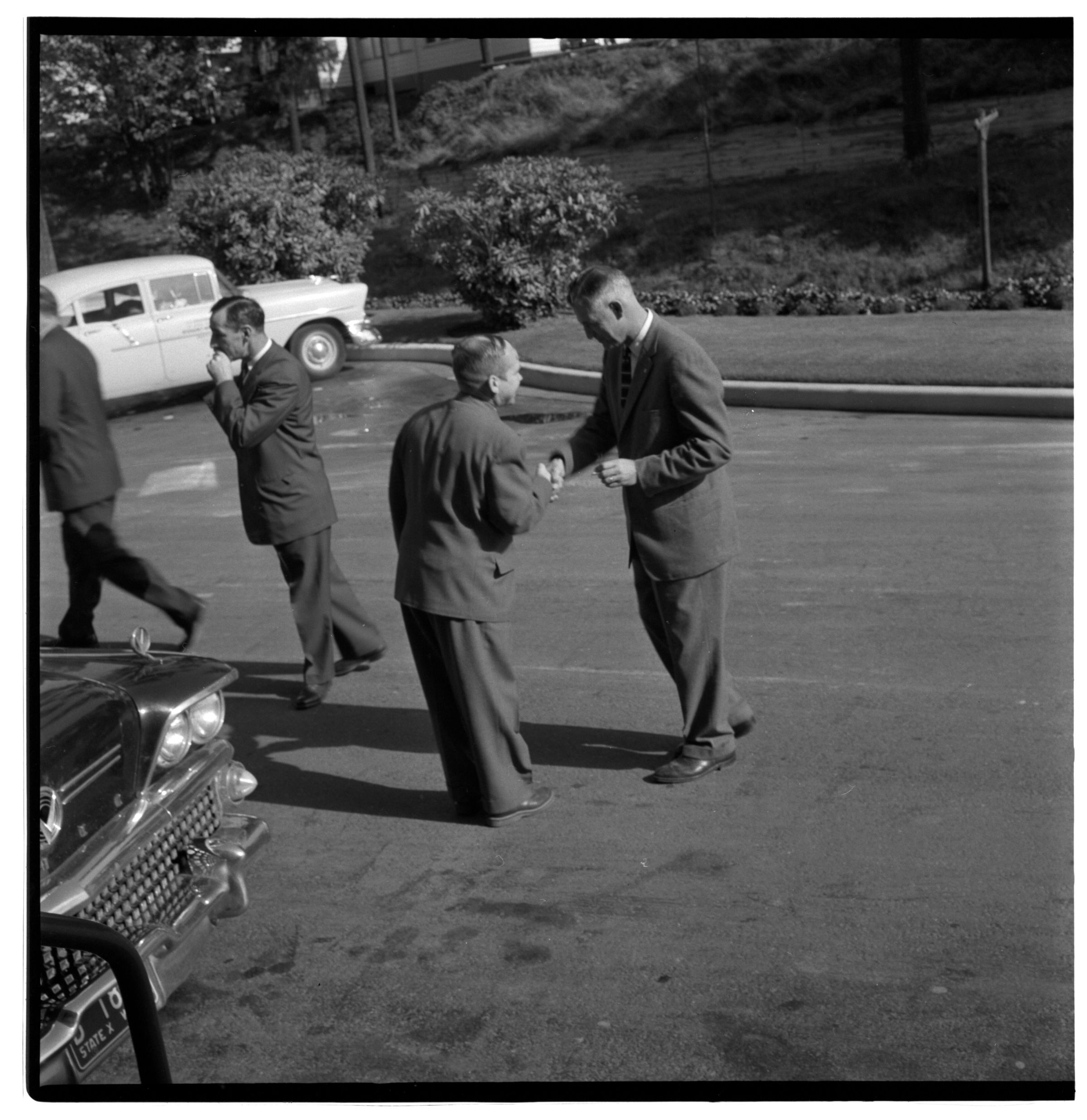 Negative, sheet film. 2 x 2 b&w. No. 690. OB Corp TV. Group of Russians visit Olympia brewery. No ID on people.