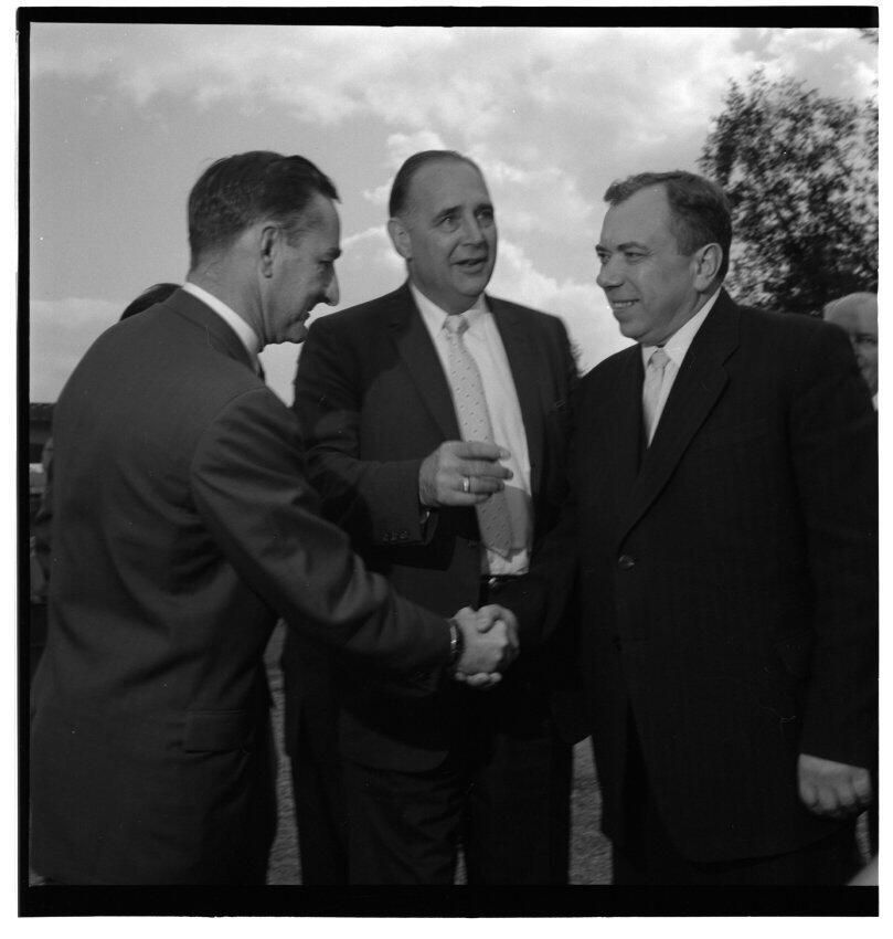 Negative, sheet film. 2 x 2 b&w. No. 690. OB Corp TV. Russians visiting brewery. Bink Schmidt at left.