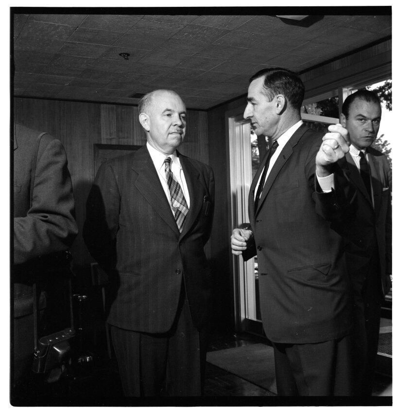 Negative, sheet film. 2 x 2 b&w. No. 690. OB Corp TV. Group of Russians visit Olympia brewery. Bink Schmidt second from right. No ID on others.