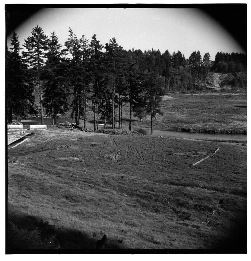 Negative, sheet film. 2 x 2 b&w. No. 690. OB Corp TV. Deschutes River valley south of Olympia Brewery.