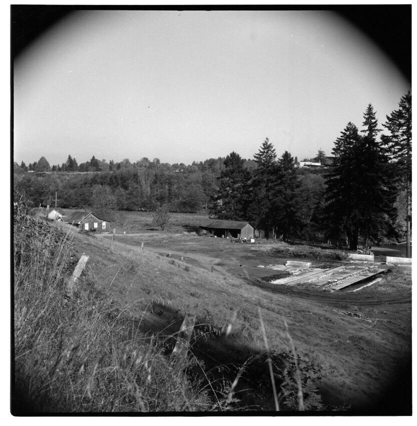 Negative, sheet film. 2 x 2 b&w. No. 690. OB Corp TV. House and farm buildings, probably just east of Capitol Blvd and south of E St.