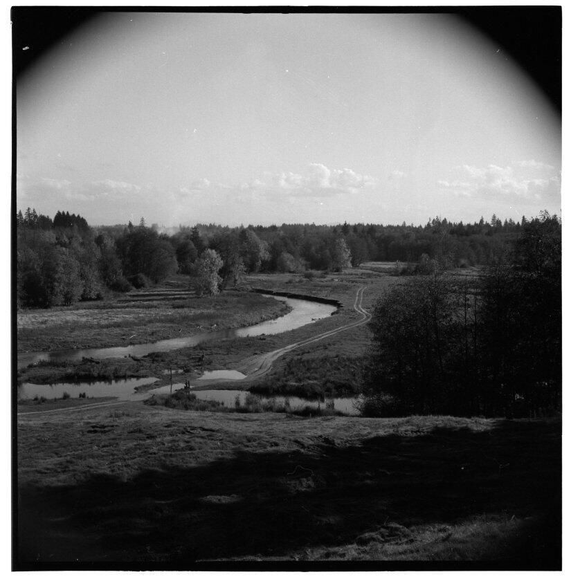 Negative, sheet film. 2 x 2 b&w. No. 690. OB Corp TV. Deschutes River winding through valley south of Olympia Brewery.