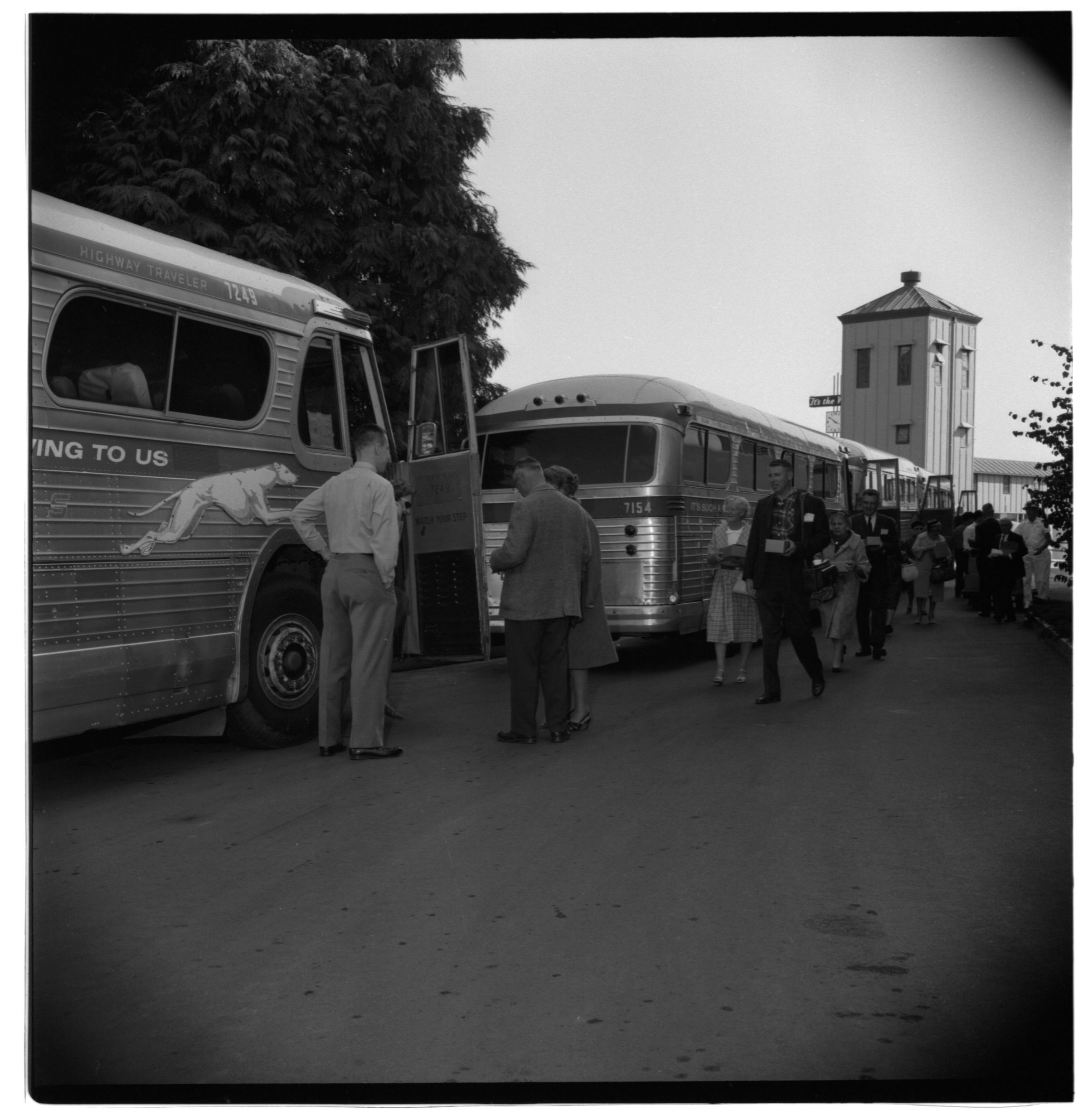 Negative, sheet film. 2 x 2 b&w. No. 915. OB Corp TV. Shriners visit Olympia brewery. No ID on people.