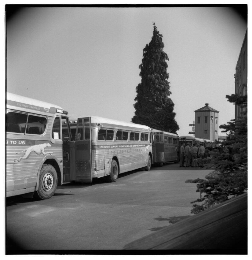 Negative, sheet film. 2 x 2 b&w. No. 915. OB Corp TV. Shriners visit Olympia brewery. No ID on people.