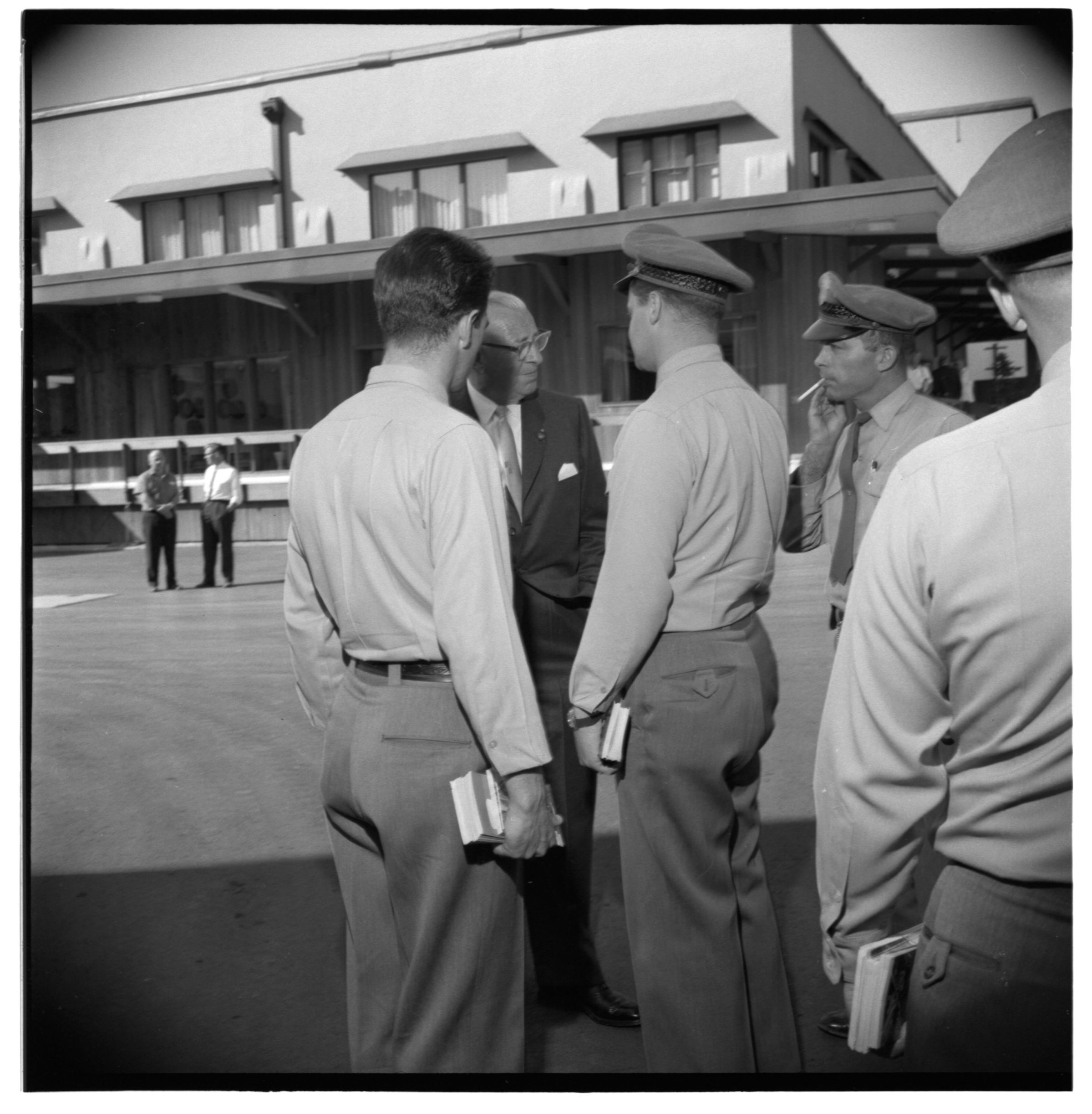Negative, sheet film. 2 x 2 b&w. No. 915. OB Corp TV. Shriners visit Olympia brewery. No ID on people.