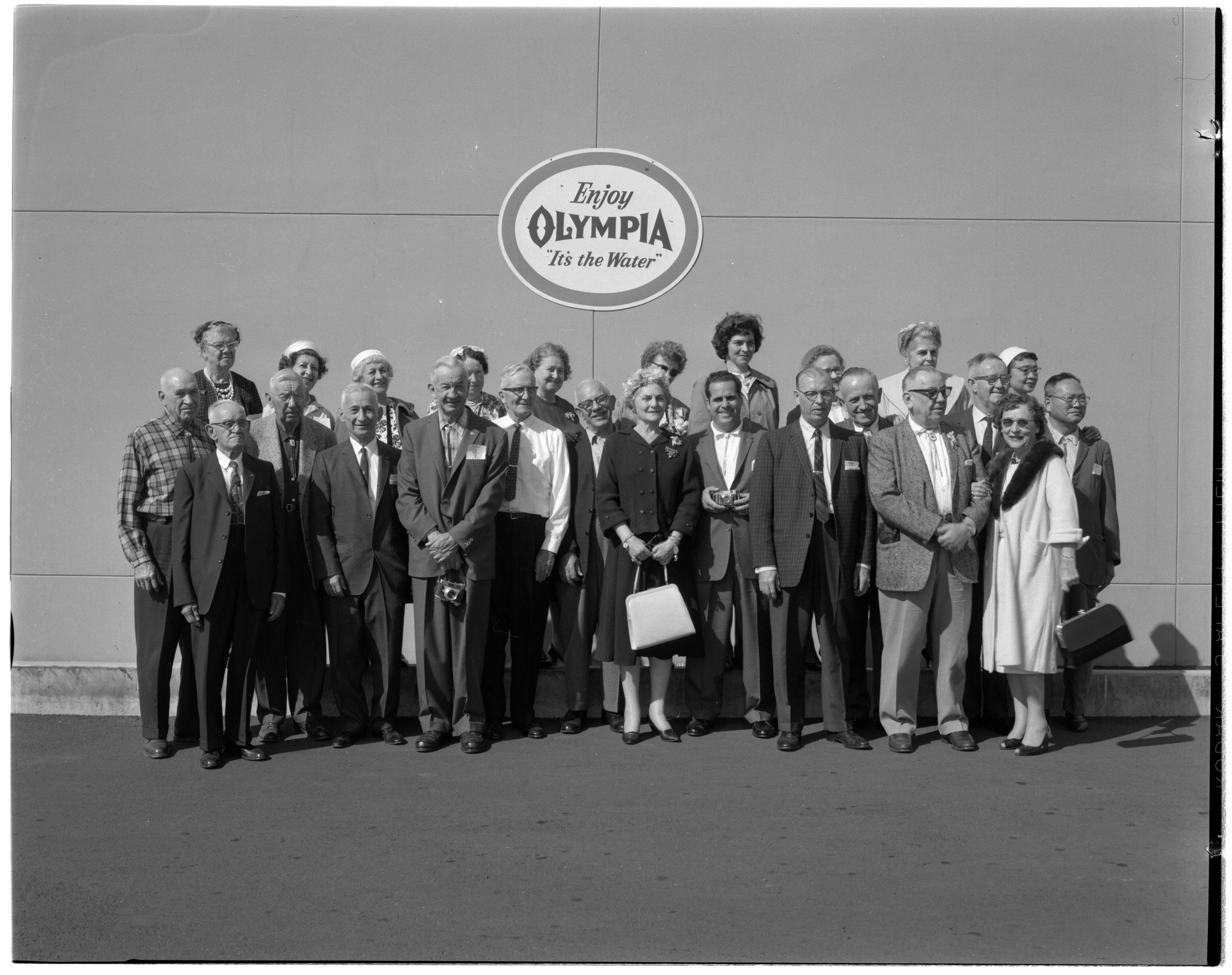 Negative, sheet film. 4 x 5 b&w. No. 915. OB Corp TV. Shriners visit Olympia brewery. No ID on people.