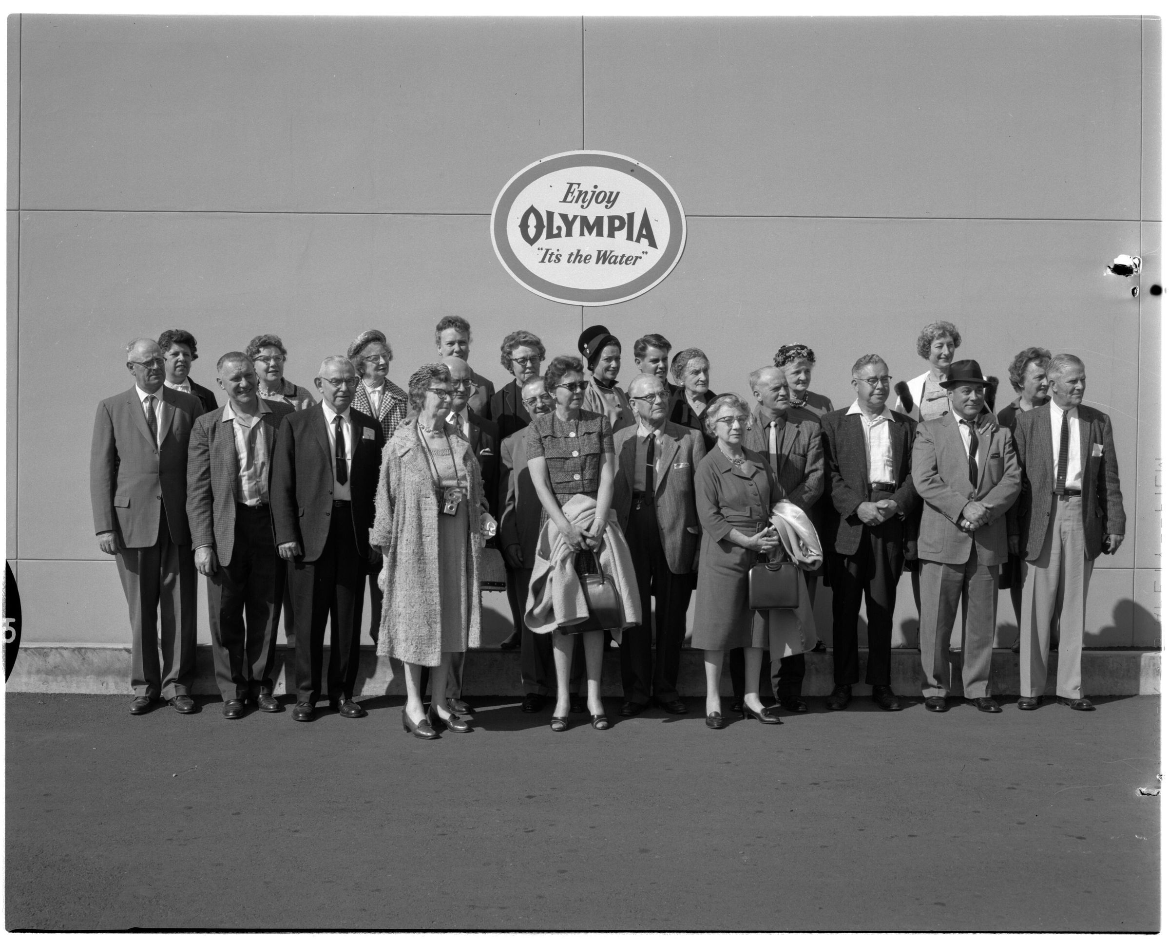 Negative, sheet film. 4 x 5 b&w. No. 915. OB Corp TV. Shriners visit Olympia brewery. No ID on people.