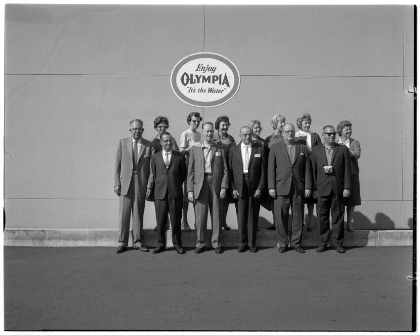 Negative, sheet film. 4 x 5 b&w. No. 915. OB Corp TV. Shriners visit Olympia brewery. No ID on people.