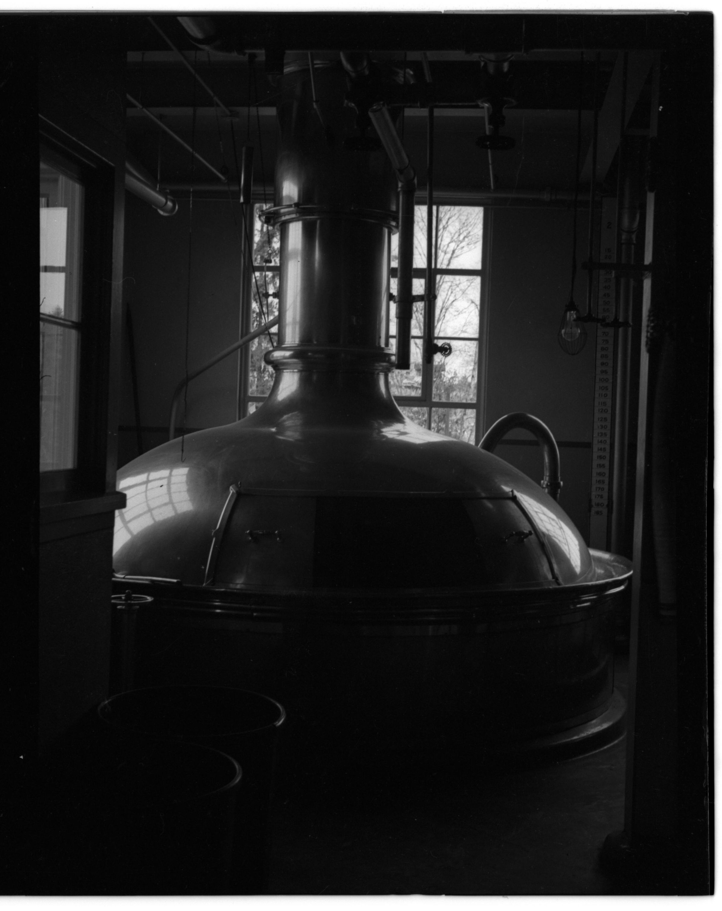 Negative, sheet film. 2 x 1.5 b&w. Copper brew kettle. Probably the 2nd brew kettle (first was in 1933).