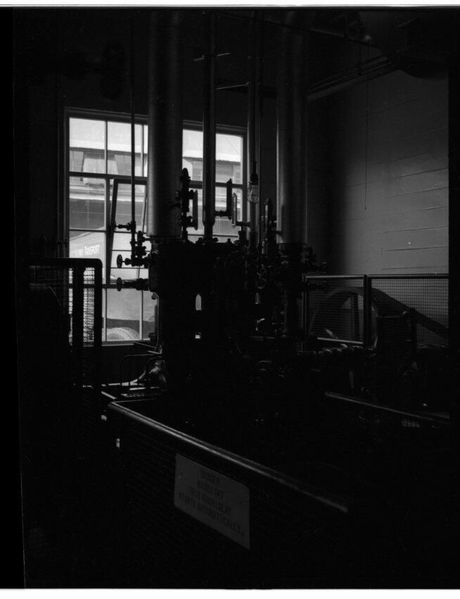 Negative, sheet film. 2 x 1.5 b&w. Brewery piping. Machine could be a big air compressor.