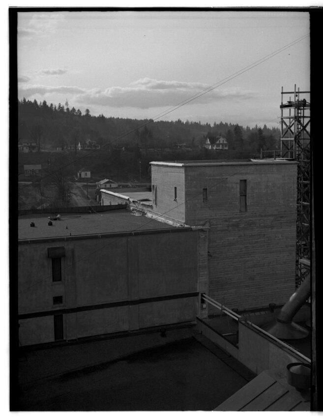 Negative, sheet film. 2 x 1.5 b&w. Brewery construction. May be from around 1906, when brewery had stopped using original wood brewhouse. Scaffolding was likely for dismantling the old smokestack. Looking northeast.Name/Title