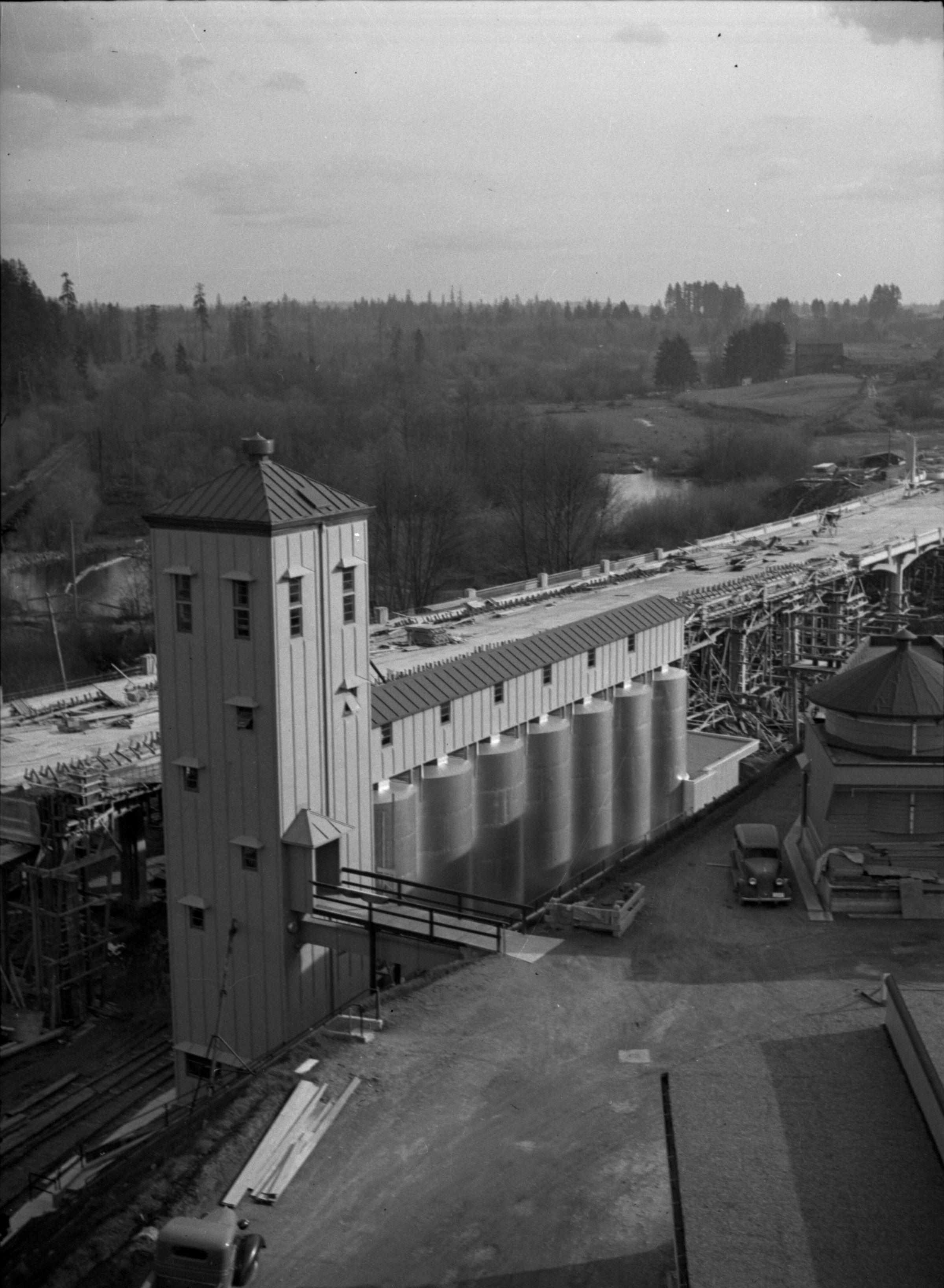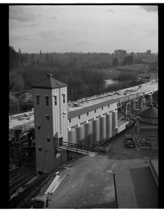 Negative, sheet film. 2 x 1.5 b&w. Carlyon bridge construction, lookinig southeast from brewery. Malt tower and grain bins in middle ground. Round turret-like structure on right is part of keghouse.Name/Title