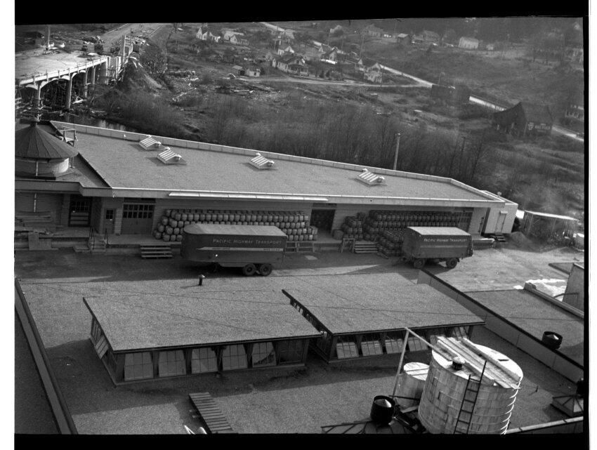 Negative, sheet film. 1.5 x 2 b&w. South side of brewery complex looking south. Trapezoid-shaped building is the keghouse.