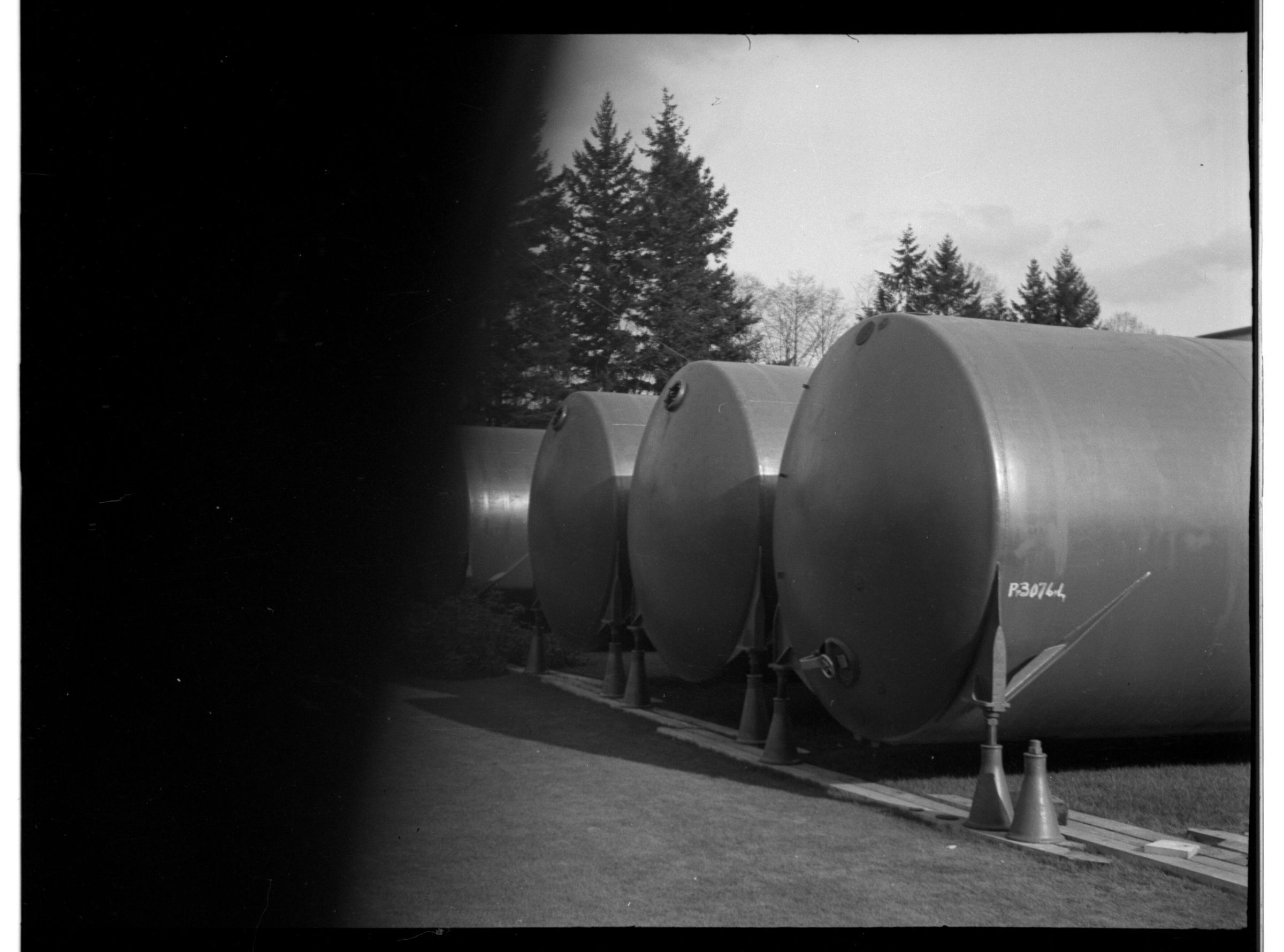 Negative, sheet film. 1.5 x 2 b&w. Aging tanks awaiting installation at Oly brewery.