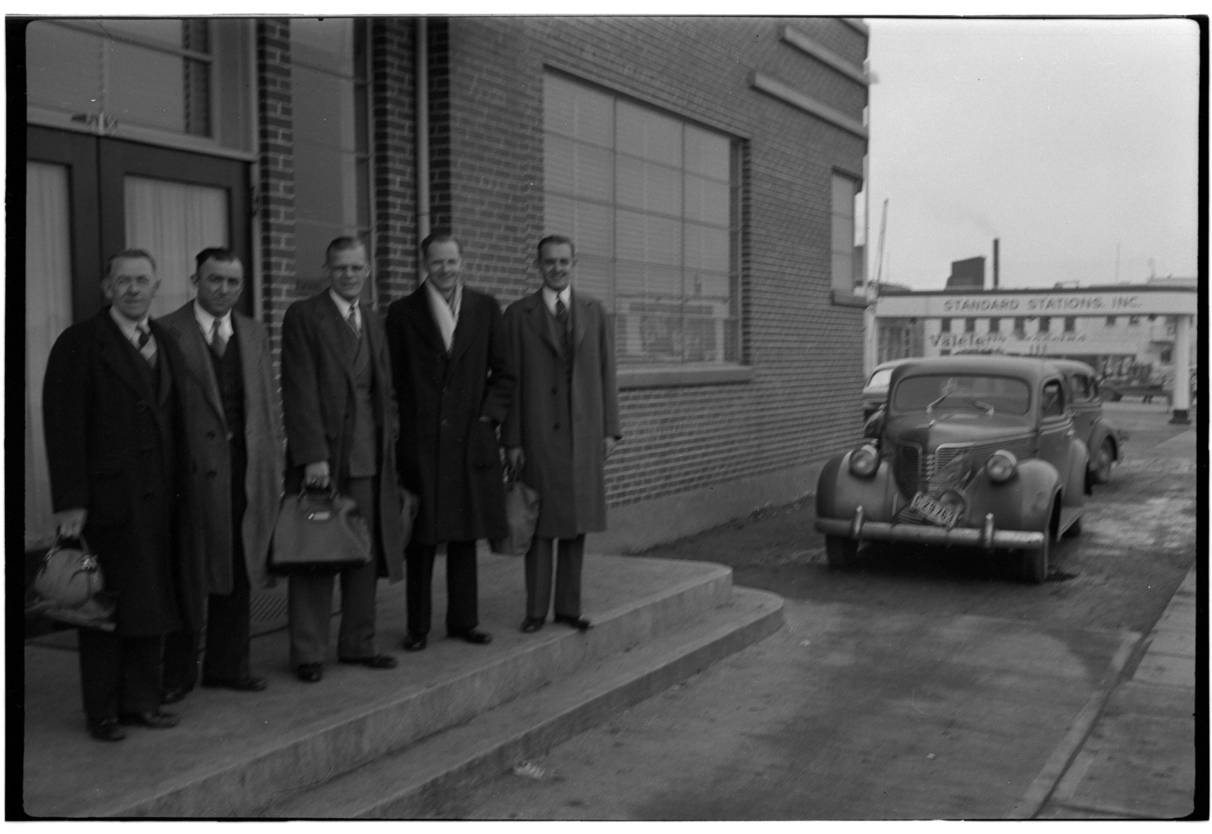 Negative, sheet film. 2 x 3 b&w. 5 unidentified men standing in front of building; unknown location.