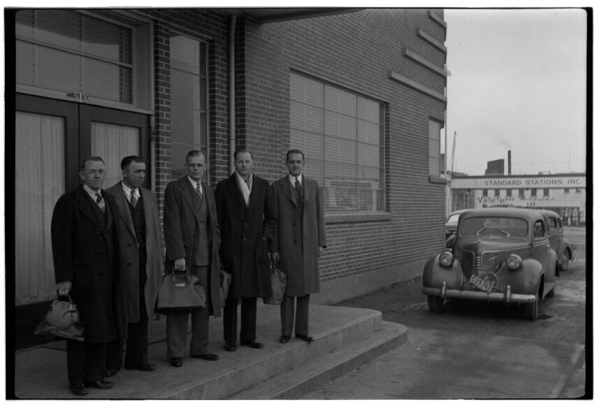 Negative, sheet film. 2 x 3 b&w. 5 unidentified men standing in front of building; unknown location.