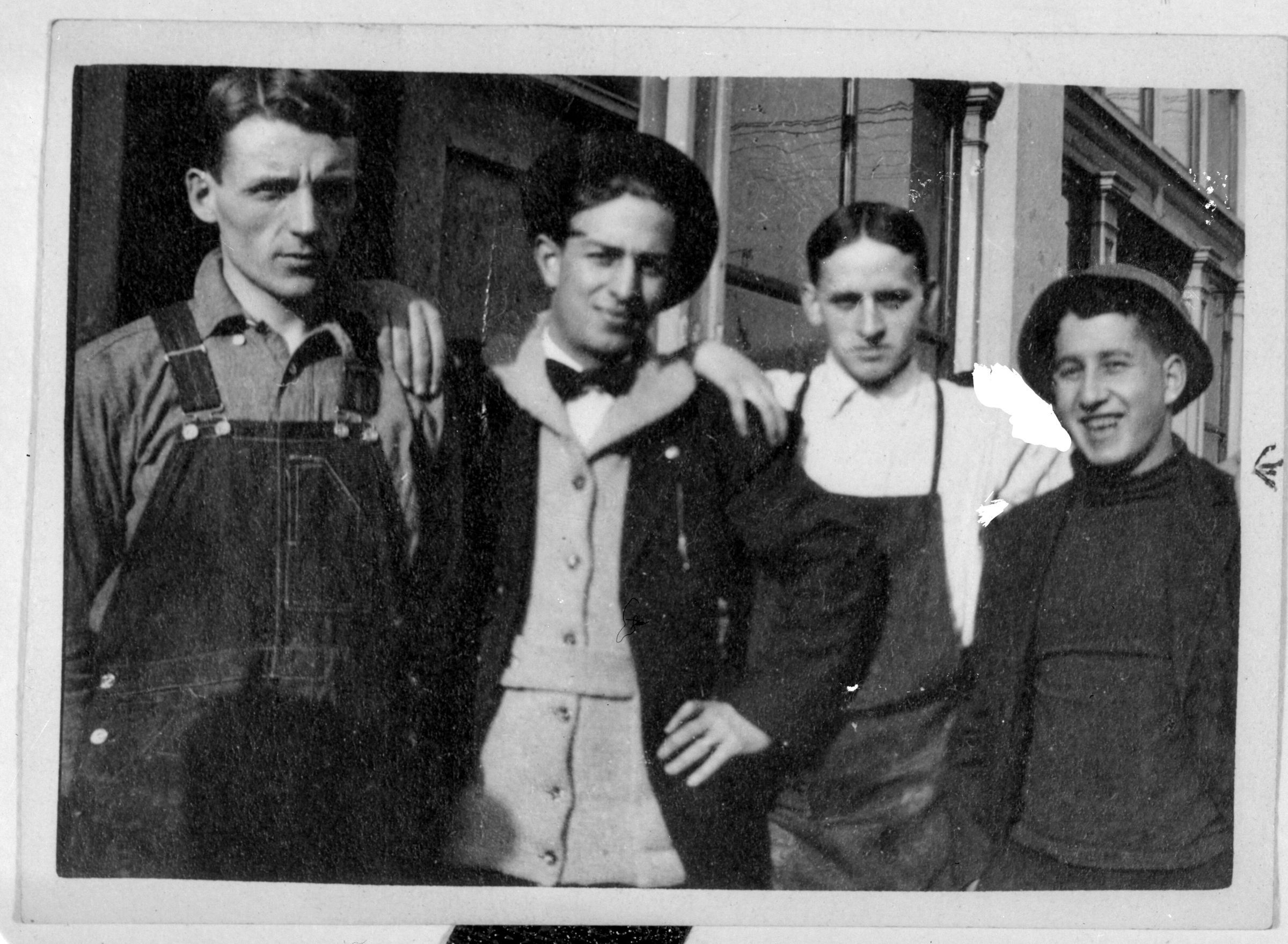 Negative, sheet film. 3 x 4 b&w. 4 young men in front of buildings; no ID on men, but man on far right may be Adolph Schmidt Sr.