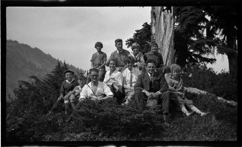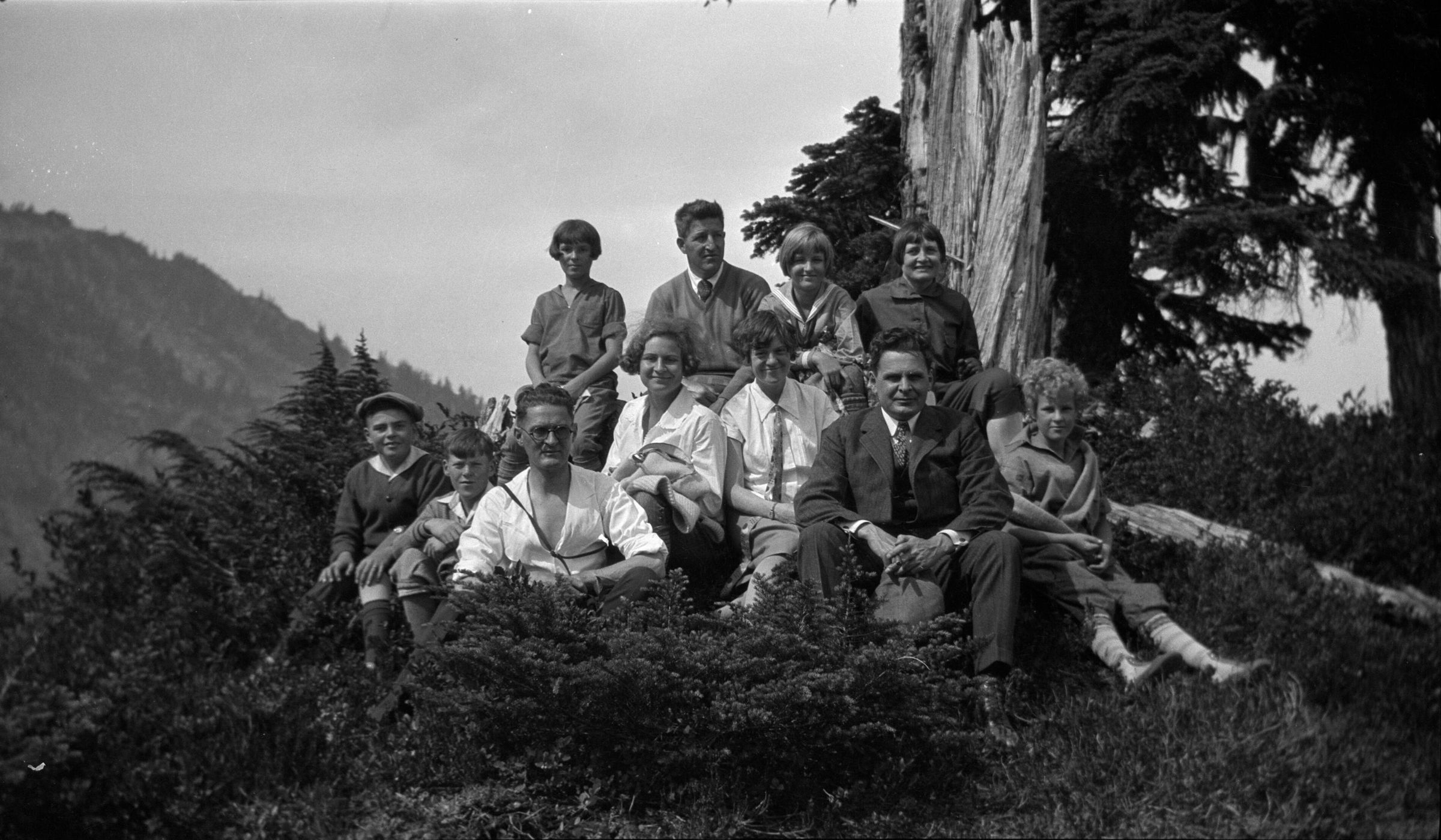 Negative, sheet film. 2.5 x 4 b&w. Peter G. Schmidt Sr. family snapshots. Group of people at Mt. Baker. Peter G. Schmidt Sr. is seated at left, in white shirt. His daughter Nootchie is on his left. Man in suit is probably Frank Schmidt. No ID on others.Name/Title