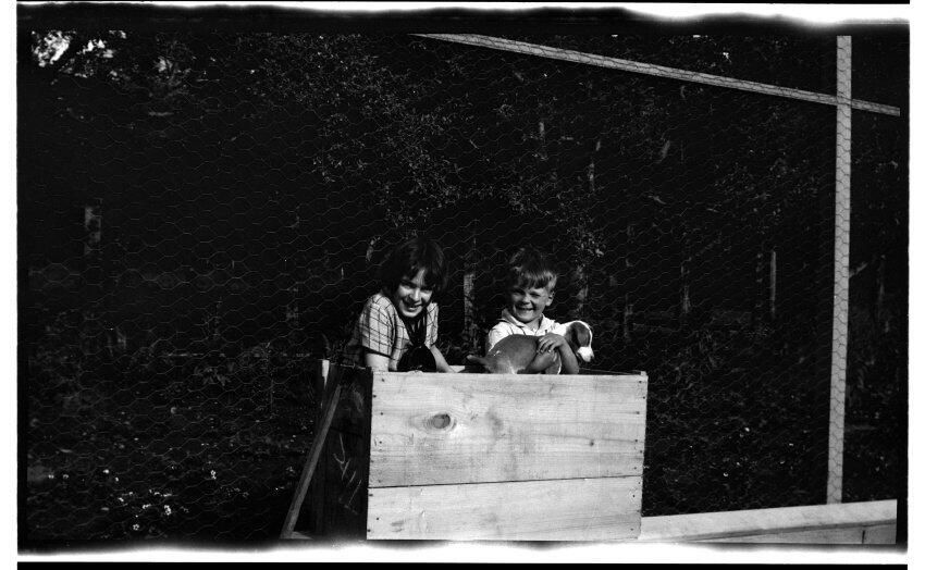 Negative, sheet film. 2.5 x 4 b&w. Peter G. Schmidt Sr. family snapshots. Two children and small dog in wooden crate. Boy holding dog may be Peter G. Schmidt Jr. (Buzzie). No ID on other child. Probably taken at Schmidt House.Name/Title