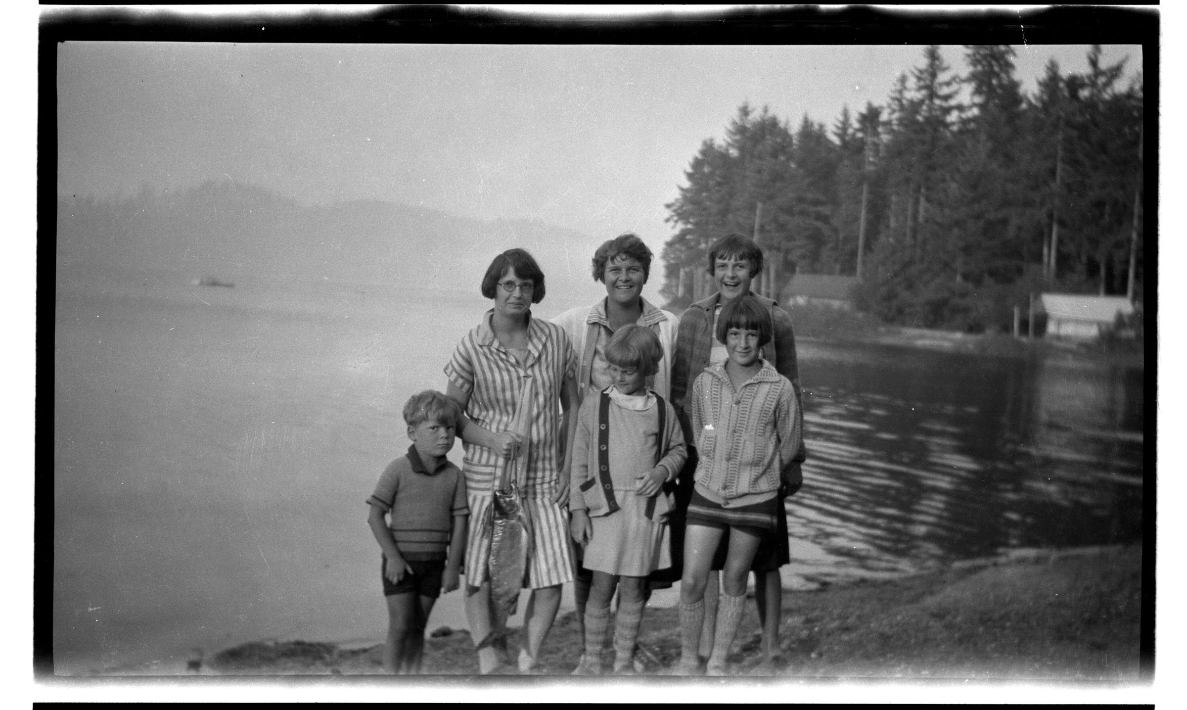 Negative, sheet film. 2.5 x 4 b&w. Peter G. Schmidt Sr. family snapshots. Group of people on saltwater beach, probably on south Puget Sound. No ID on people, but probably Schmidt family members.