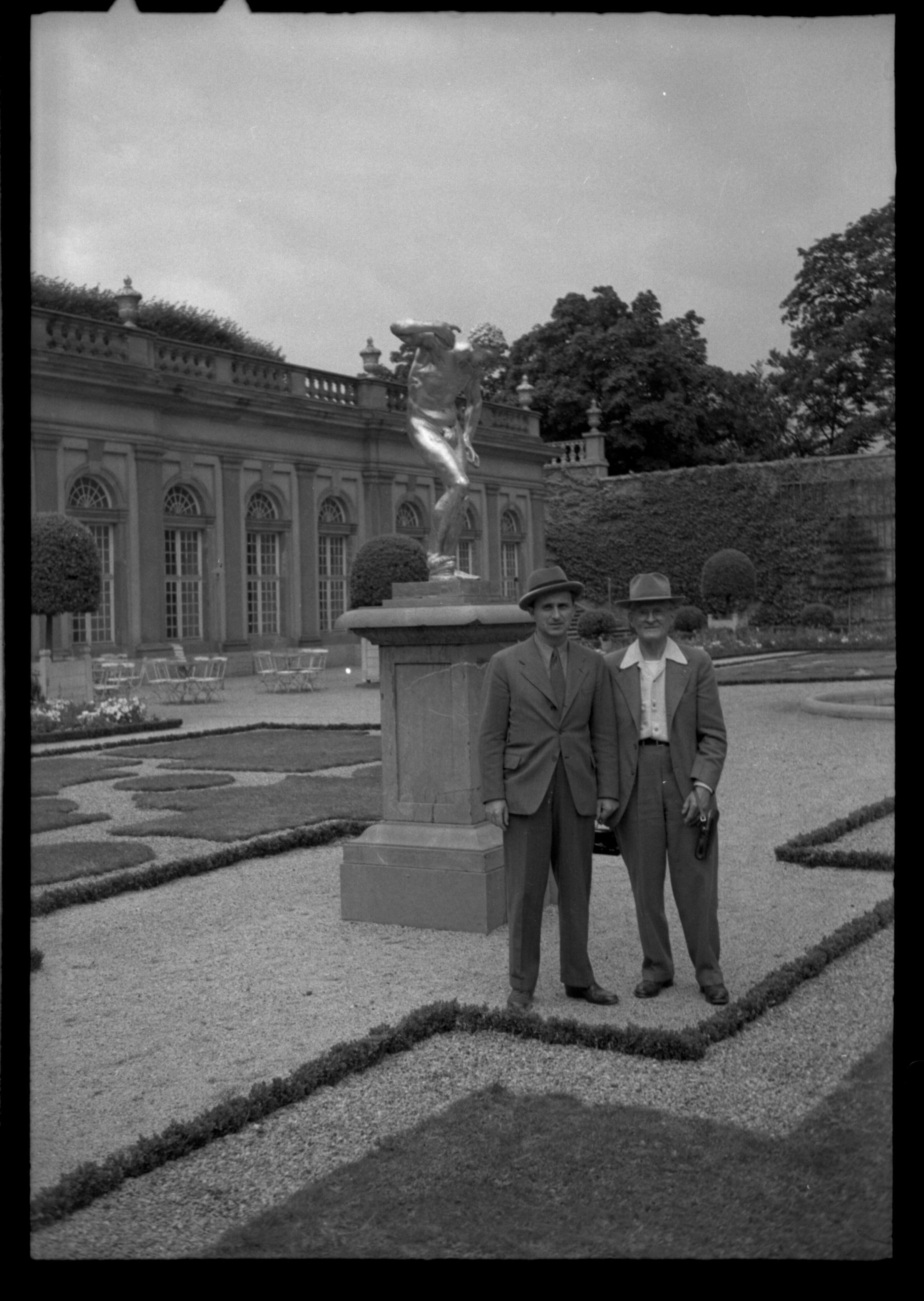 Negative, sheet film. 1.5 x 1 b&w. Peter G. Schmidt Sr. family snapshots. Peter G. Schmidt Sr. and Heinz Glasser (Peter's cousin who lived in Limburg) standing in courtyard/garden of unidentified place in Germany.Name/Title