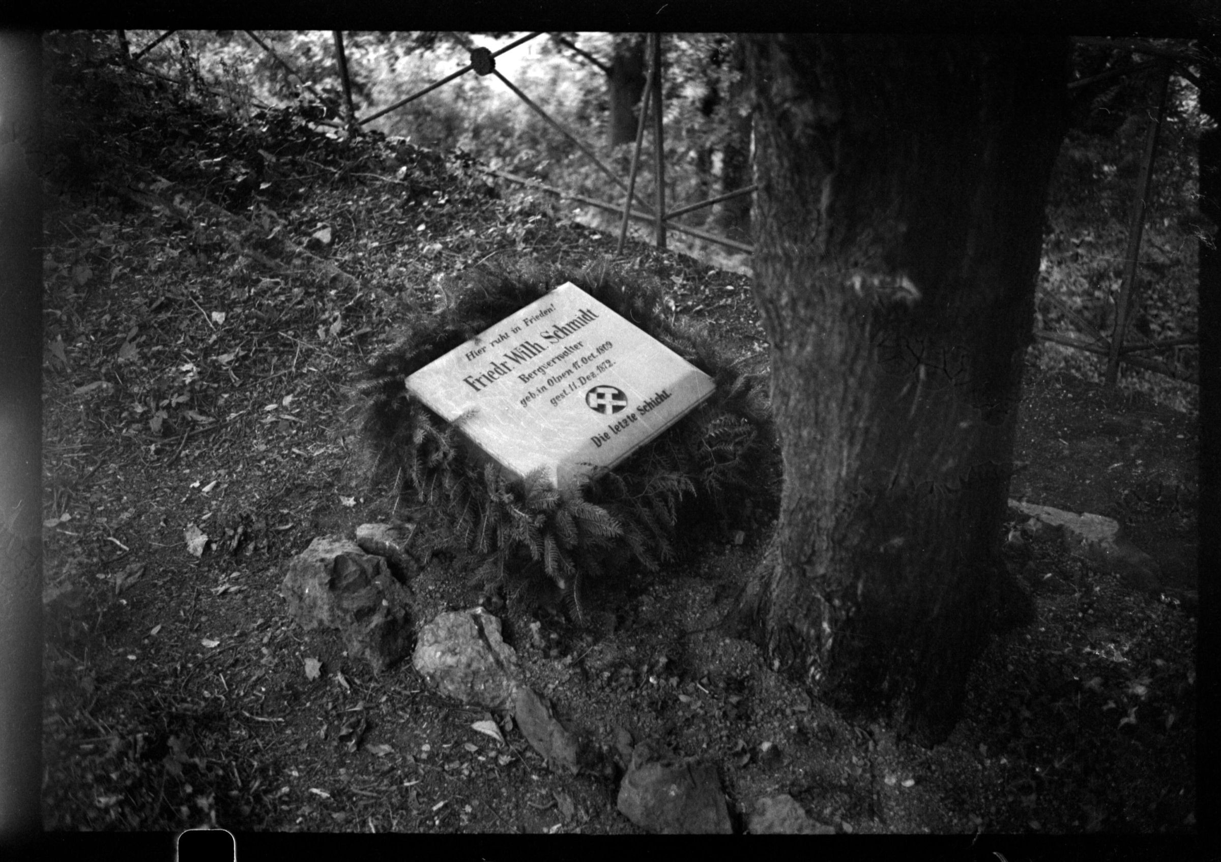 Negative, sheet film. 1 x 1.5 b&w. Peter G. Schmidt Sr. family snapshots. Photo of grave of Friedrich Wilhelm Schmidt, father of Leopold F. Schmidt. Located in Weilburg, Germany.