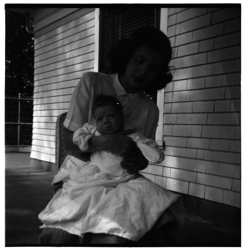 Negative, sheet film. 2 x 2 b&w. Peter G. Schmidt Sr. family snapshots. Woman and baby, no ID.