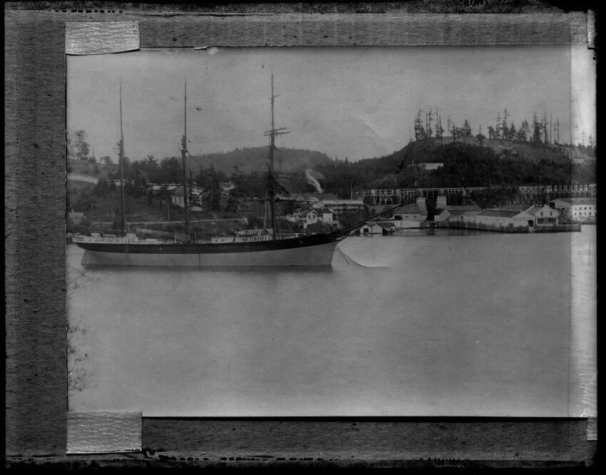 Negative, sheet film. 3 x 4 b&w. Sailing ship "Archer" which was converted from sail to gas-powered engine invented by Peter G. Schmidt Sr. Photo may be taken at Roche Harbor, WA, where Archer was retrofitted.Name/Title
