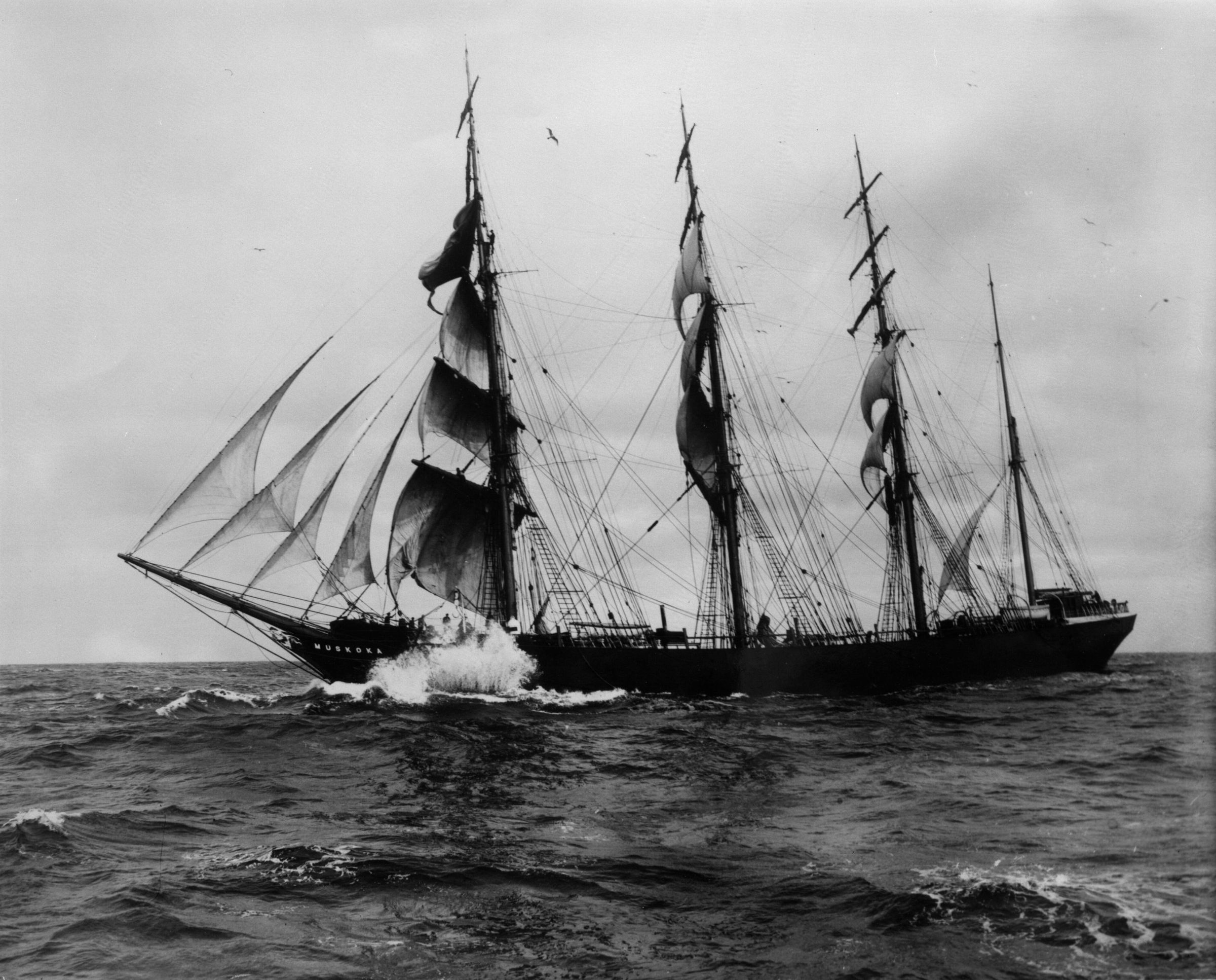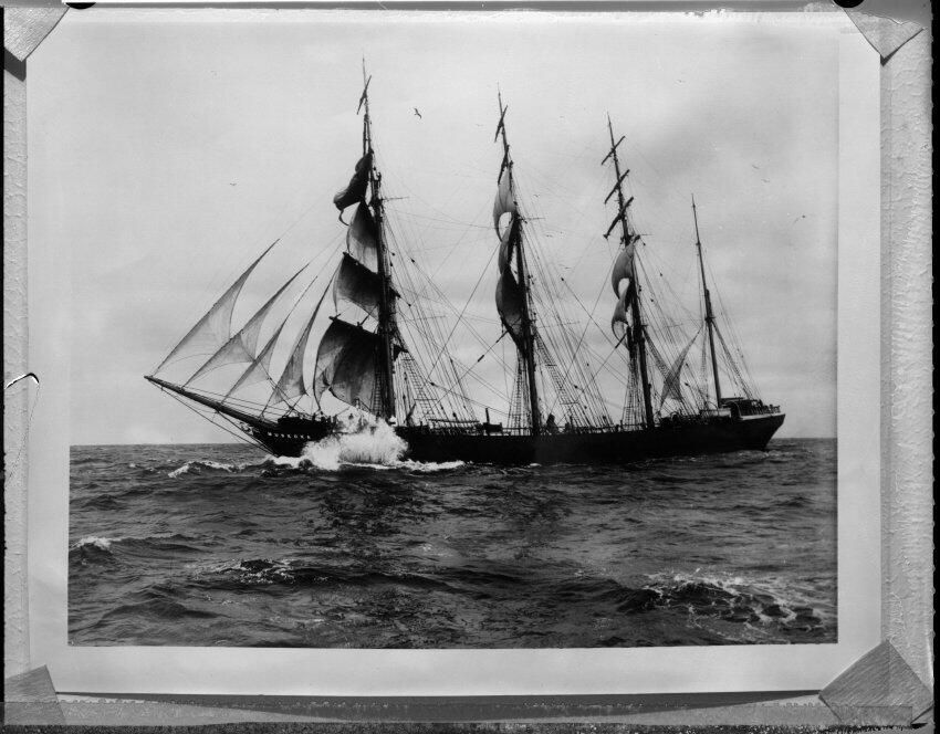Negative, sheet film. 3 x 4 b&w. Unknown sailing ship. This is not the Archer, as the Archer had 3 masts; this ship has 4.