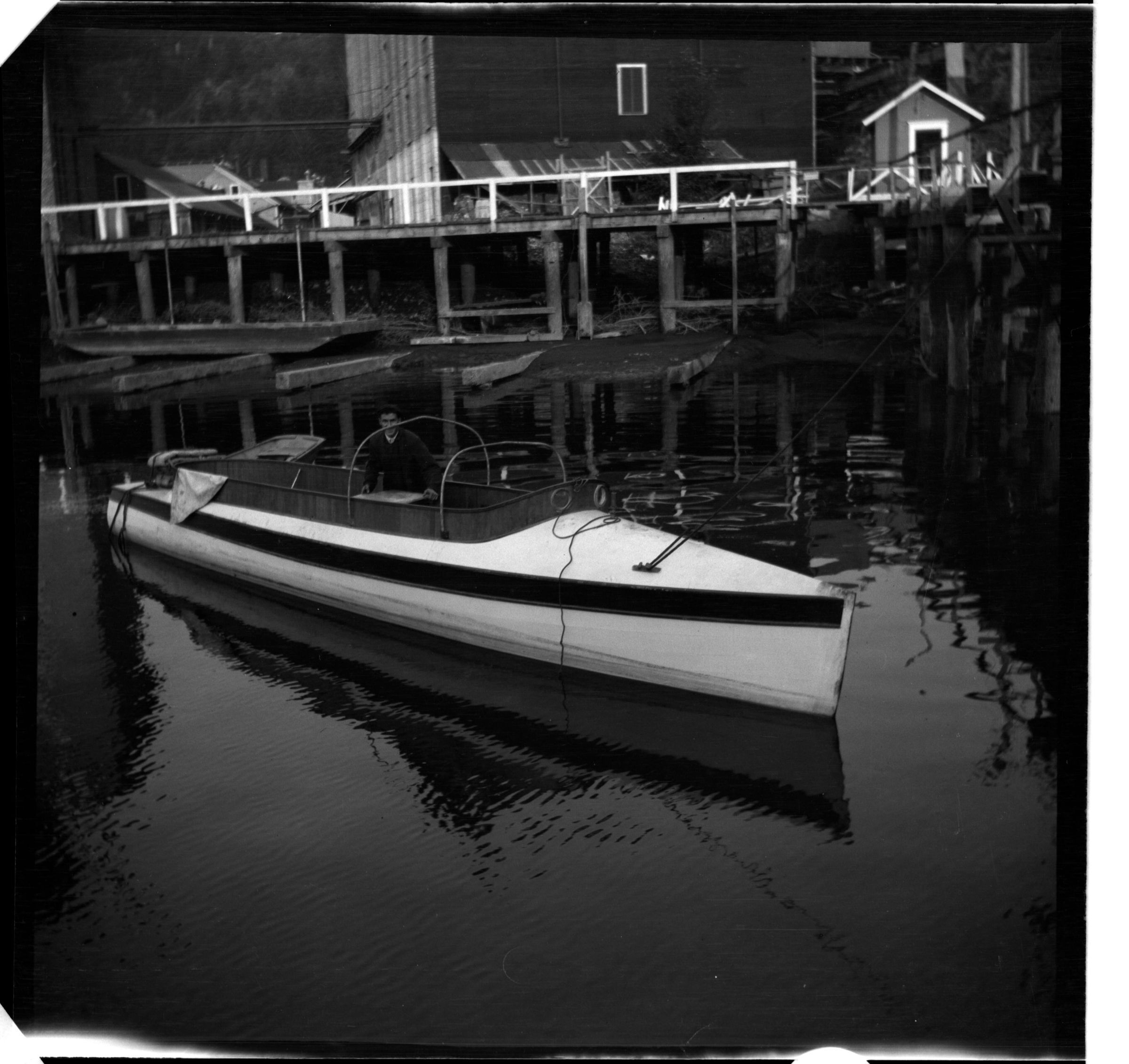 Negative, sheet film. 3.5 x 3.5 b&w. Small motor boat, possibly "Peter G." Photo may be in Alaska; man in boat may be Adolph Schmidt Sr.