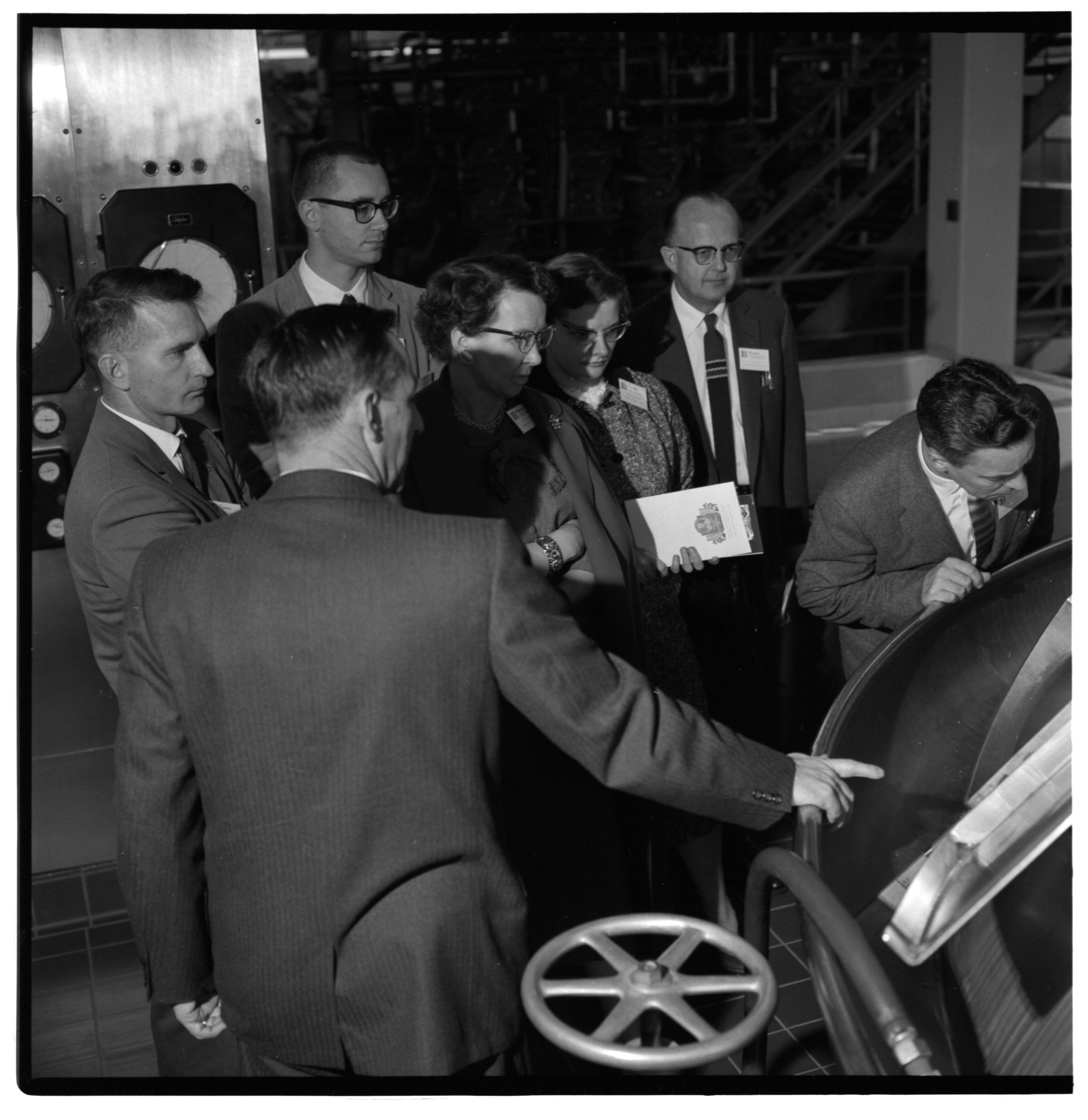 Negative, sheet film. 2 x 2 b&w. No. 693. OB Corp TV. Group of teachers tours the Olympia brewery. Visit was part of Teachers Business Education Day, coordinated by the Olympia Chamber of Commerce. 454 teachers from Thurston County were involved.Name/Title