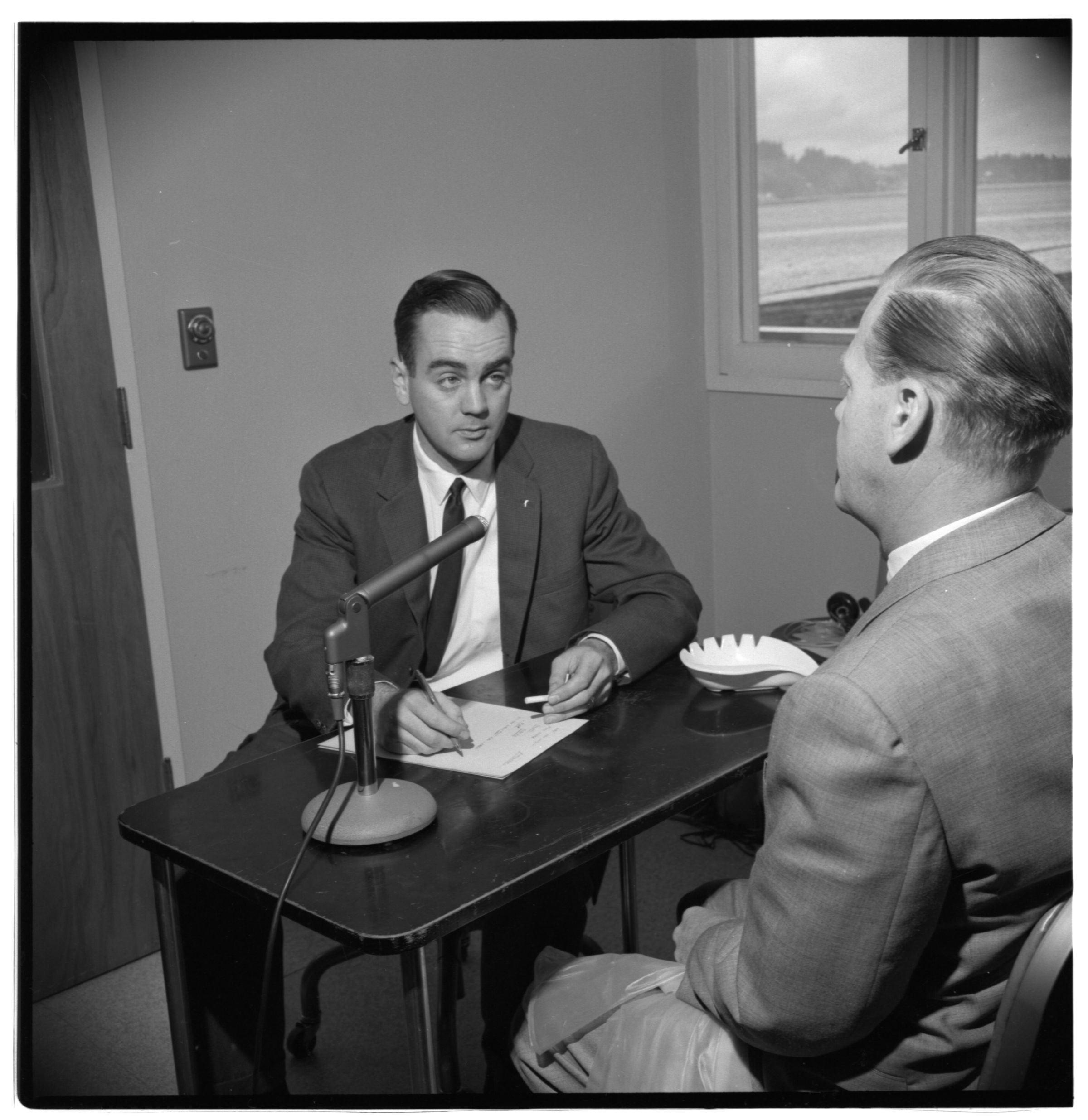 Negative, sheet film. 2 x 2 b&w. No. 884. OB Corp TV. Hank Weaver, radio sports personality from California, visits Olympia brewery and KGY. Article in May 1962 "Its the Water News." At left is Russ Butler of KGY.Name/Title