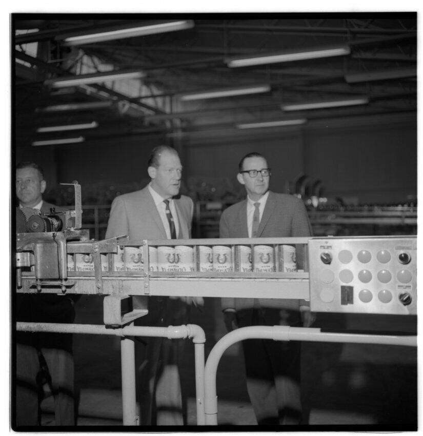 Negative, sheet film. 2 x 2 b&w. No. 884. OB Corp TV. Hank Weaver, radio sports personality from California, visits Olympia brewery and KGY. Article in May 1962 "Its the Water News." Bobby Schmidt on right. No ID on man on left.Name/Title