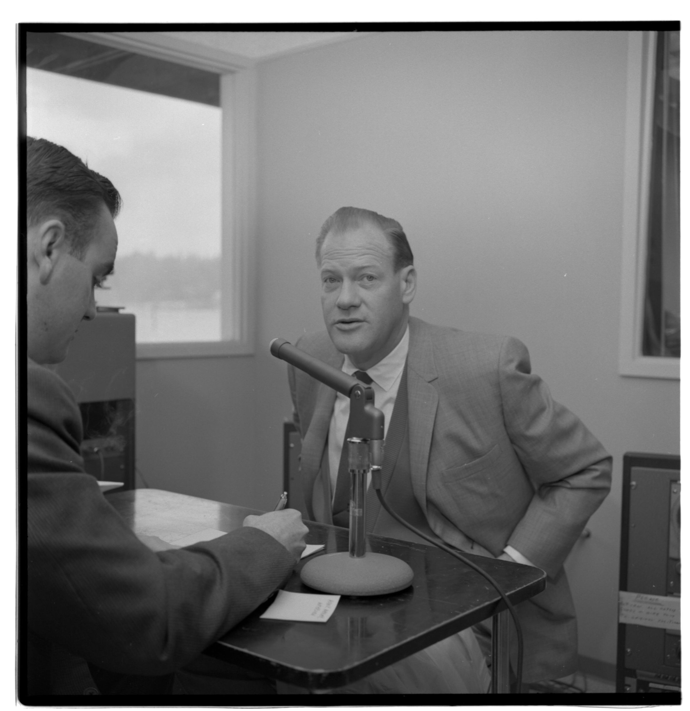 Negative, sheet film. 2 x 2 b&w. No. 884. OB Corp TV. Hank Weaver, radio sports personality from California, visits Olympia brewery and KGY. Article in May 1962 "Its the Water News." On left is Russ Butler of KGY.Name/Title