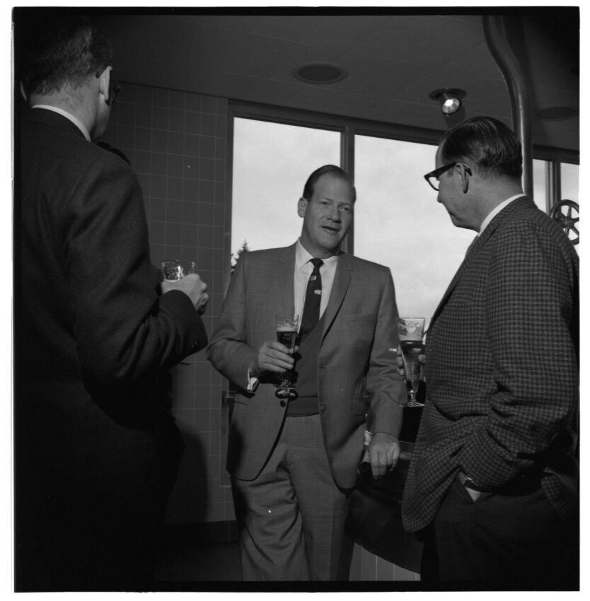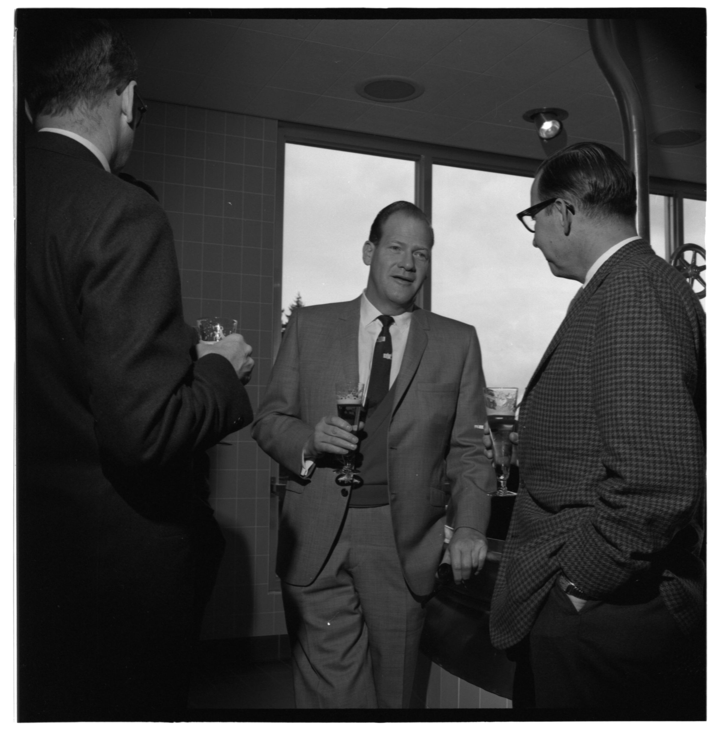 Negative, sheet film. 2 x 2 b&w. No. 884. OB Corp TV. Hank Weaver, radio sports personality from California, visits Olympia brewery and KGY. Article in May 1962 "Its the Water News." Bobby Schmidt at right. No ID on man on left.Name/Title