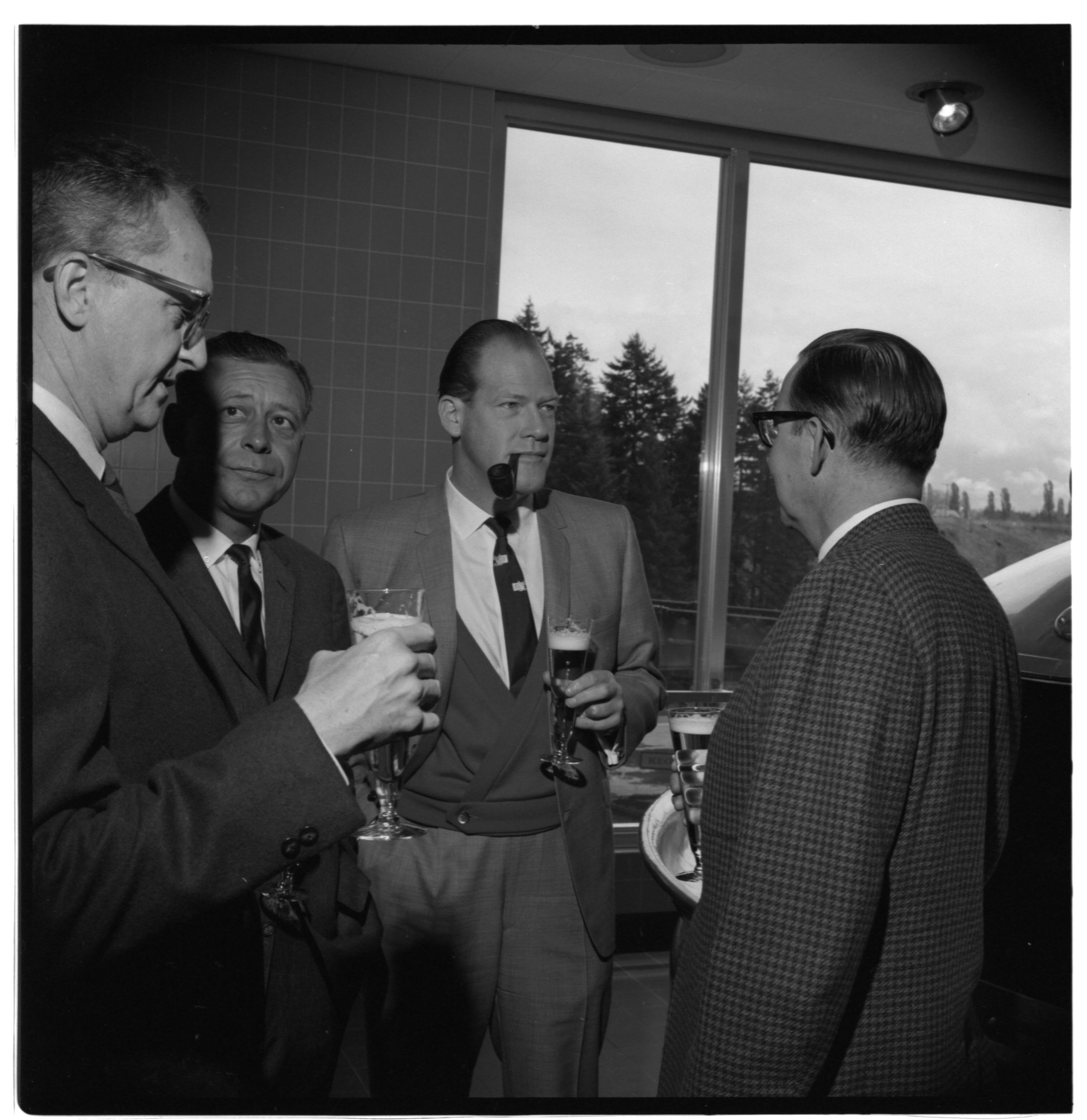 Negative, sheet film. 2 x 2 b&w. No. 884. OB Corp TV. Hank Weaver, radio sports personality from California, visits Olympia brewery and KGY. Article in May 1962 "Its the Water News." Bobby Schmidt at right. No ID on man on left. Second from left is Barney Renderer of OBC.Name/Title
