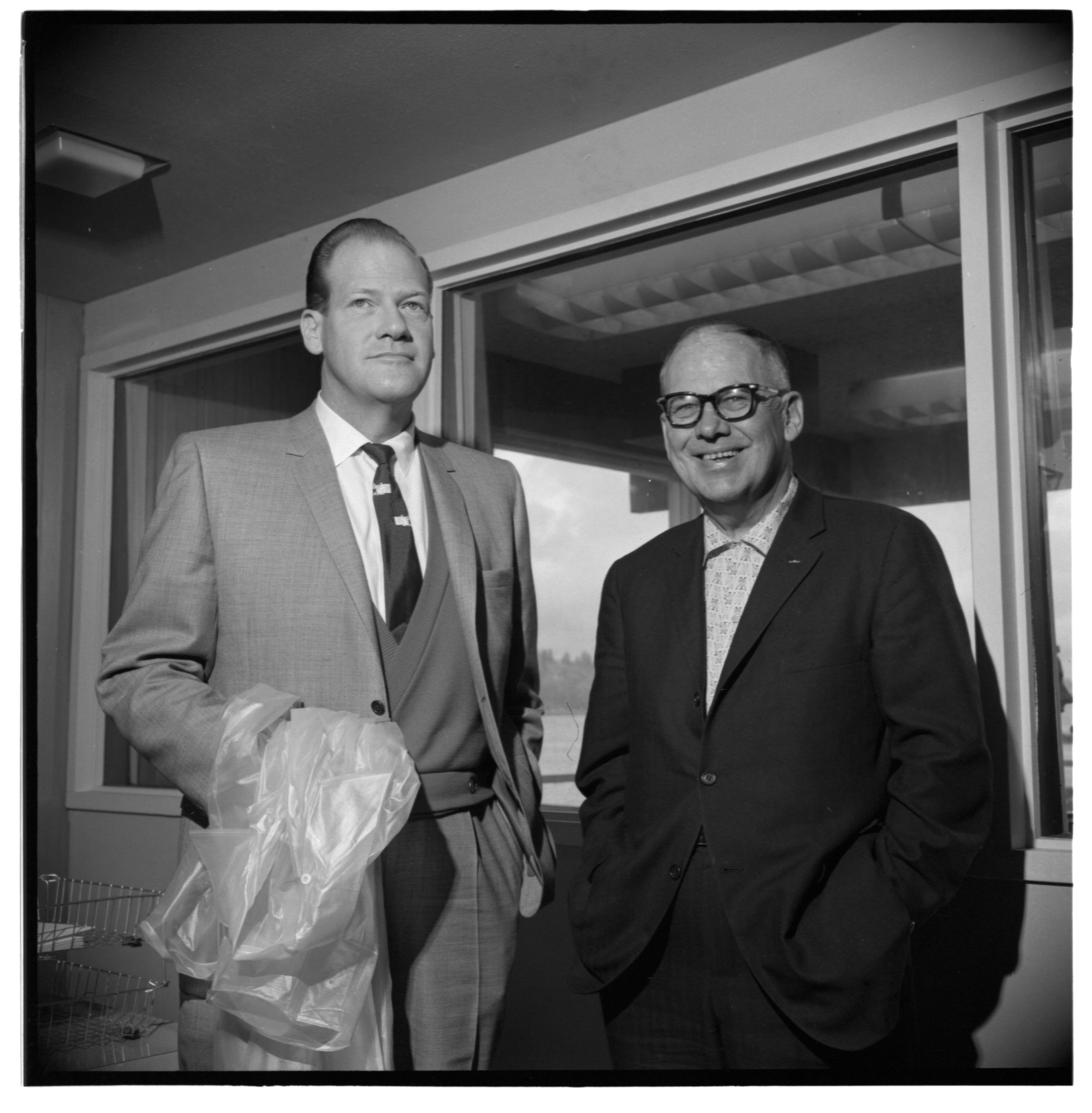 Negative, sheet film. 2 x 2 b&w. No. 884. OB Corp TV. Hank Weaver, radio sports personality from California, visits Olympia brewery and KGY. Article in May 1962 "Its the Water News." No ID on man on right.Name/Title